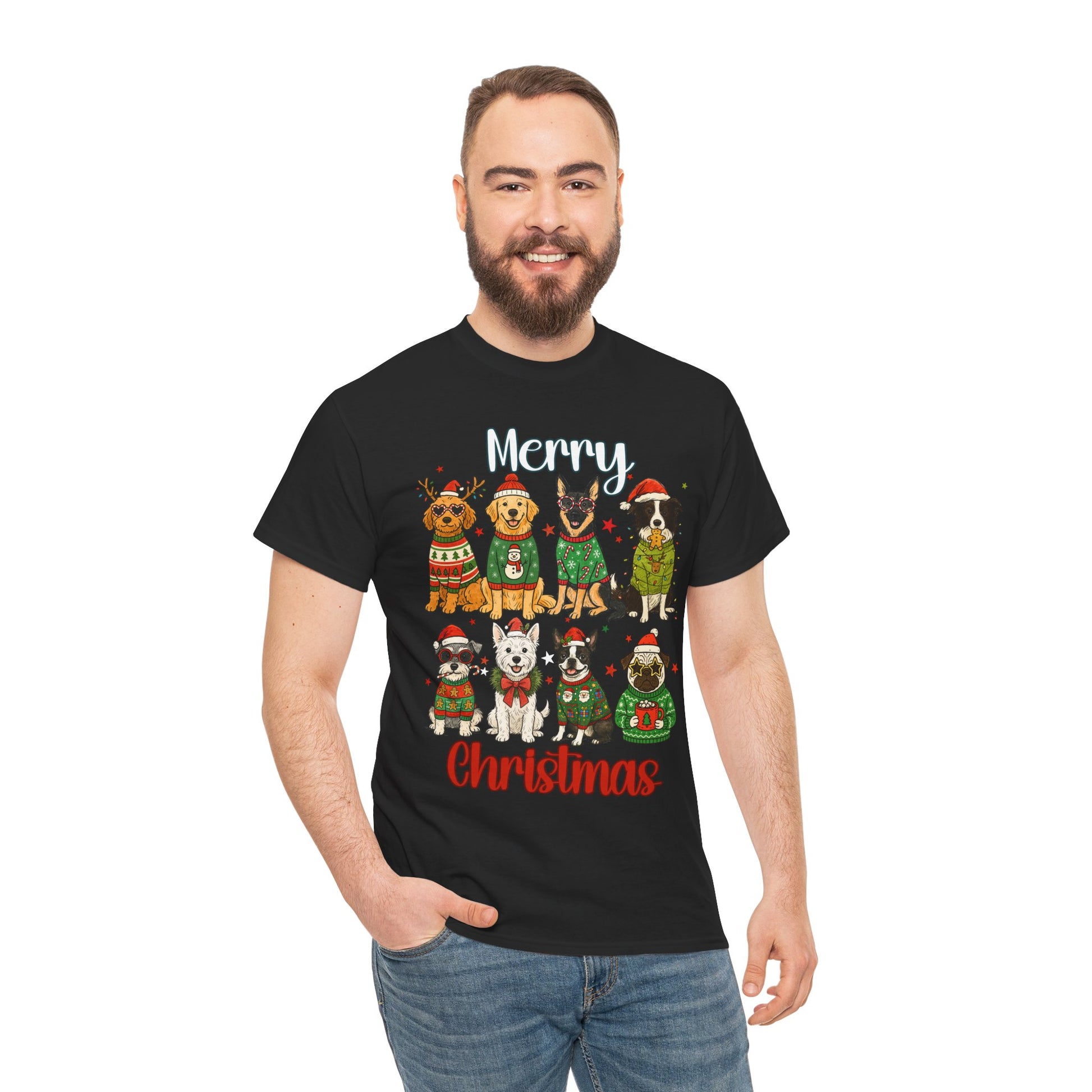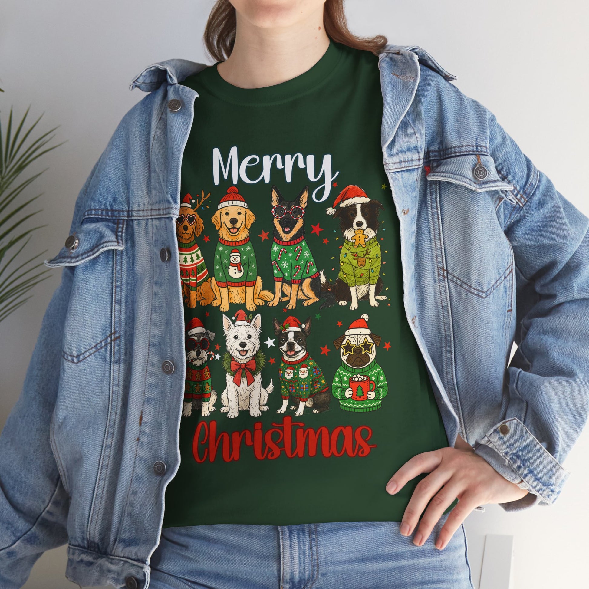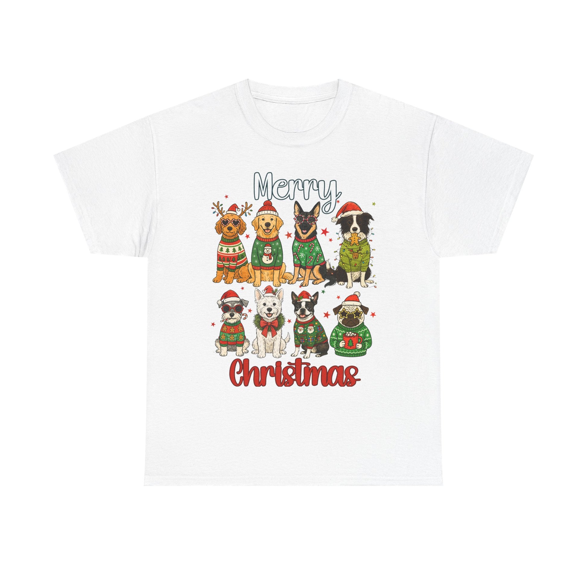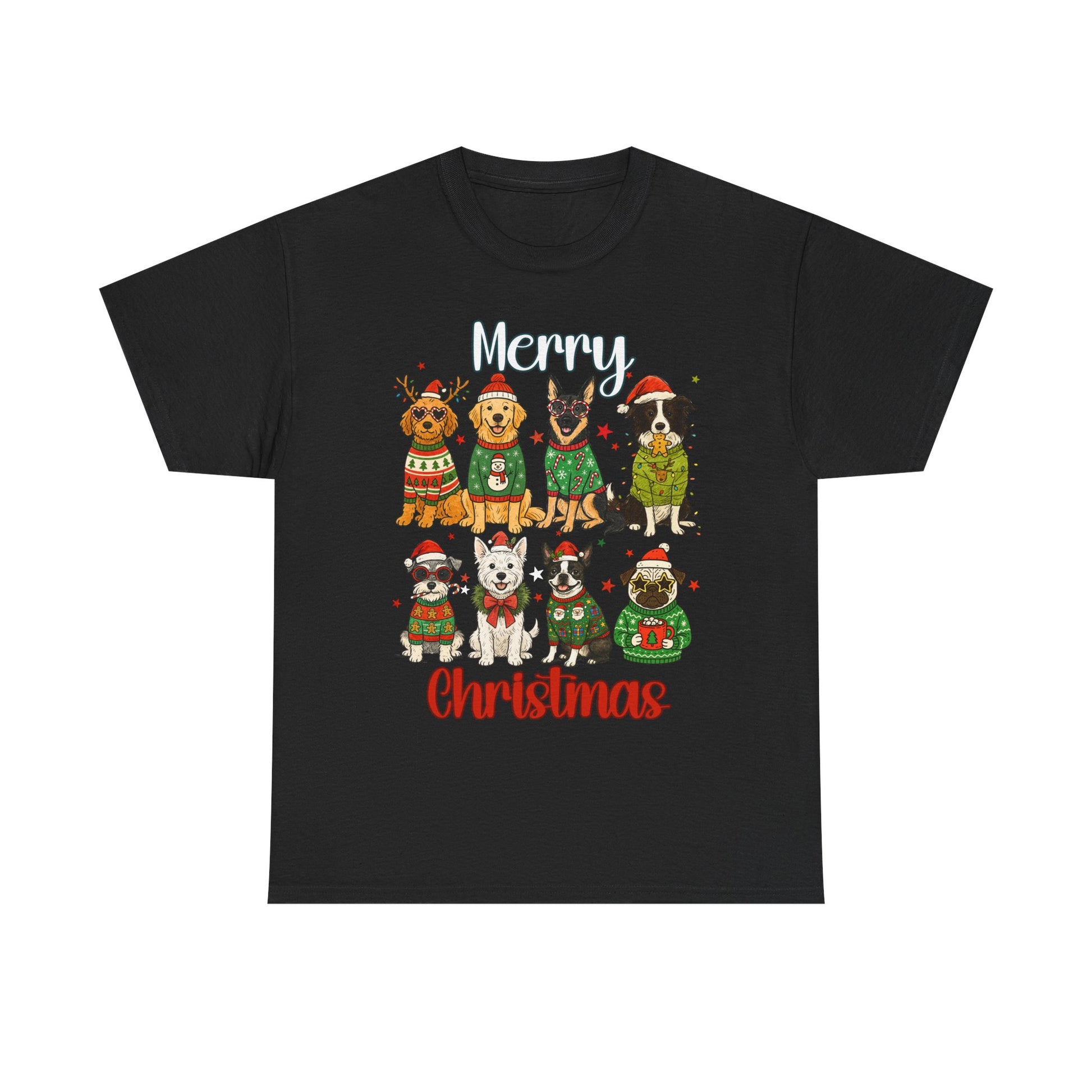 Eight goofy pups decked out in knit sweaters and Santa hats march across the chest, each one caught mid-joy — a snaggle-toothed corgi grin, a dignified lab’s stoic stare, a fluffball shaking snow from its coat. Simple, warm, and a little silly, this shirt carries the quiet chaos of a family holiday: the living room strewn with twinkling lights, the scent of spice from the kitchen, and the sound of paws on hardwood. Slip it on for casual gatherings, morning cocoa runs, or a cozy movie night; the soft cotton and classic crew shape sit easy while the print sparks smiles and conversation. It’s for dog people who love the mess and magic of the season and want their outfit to say so — low-key festive, honest, and full of heart.