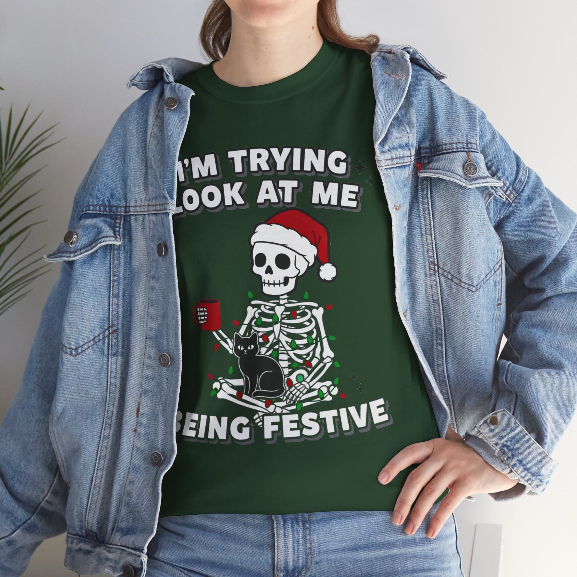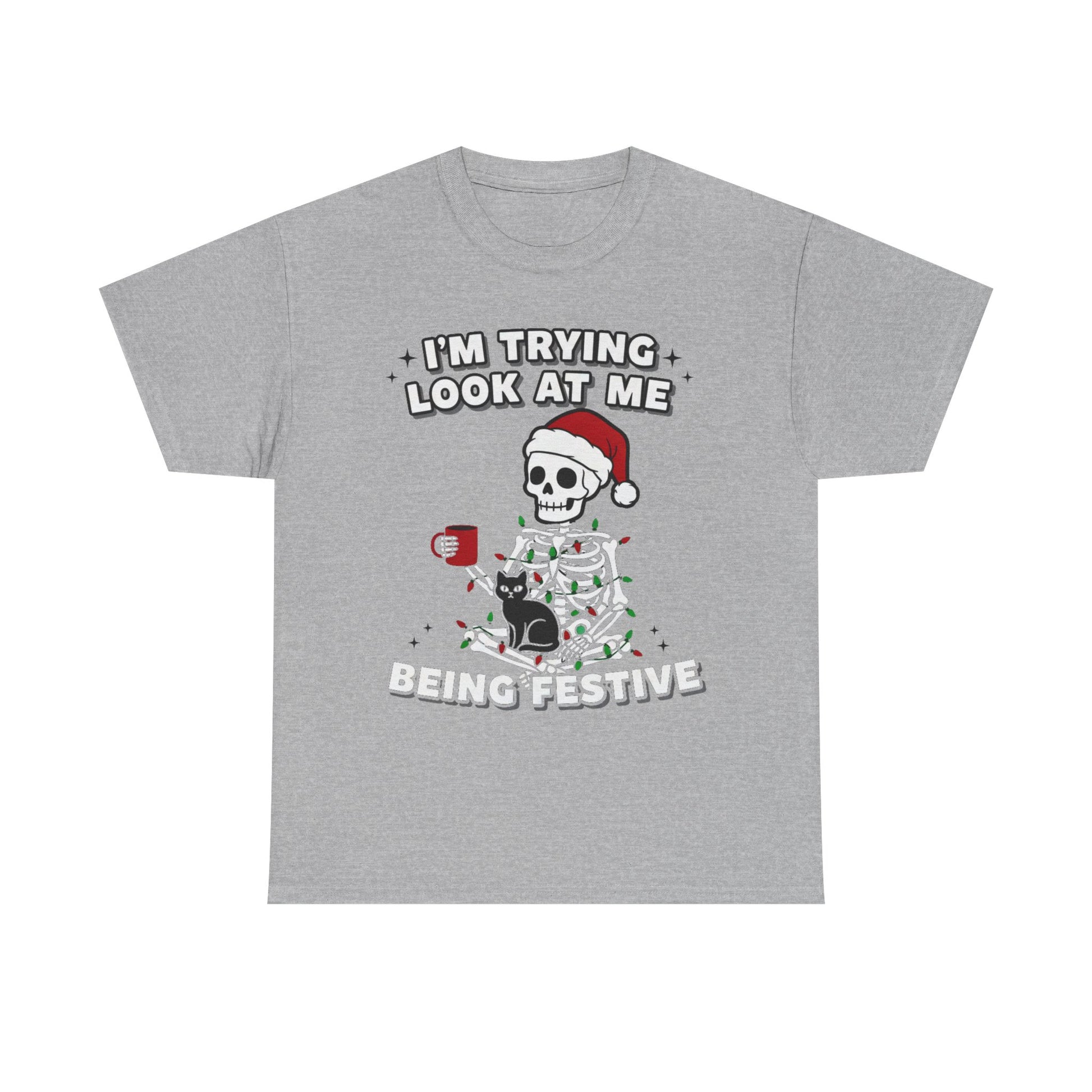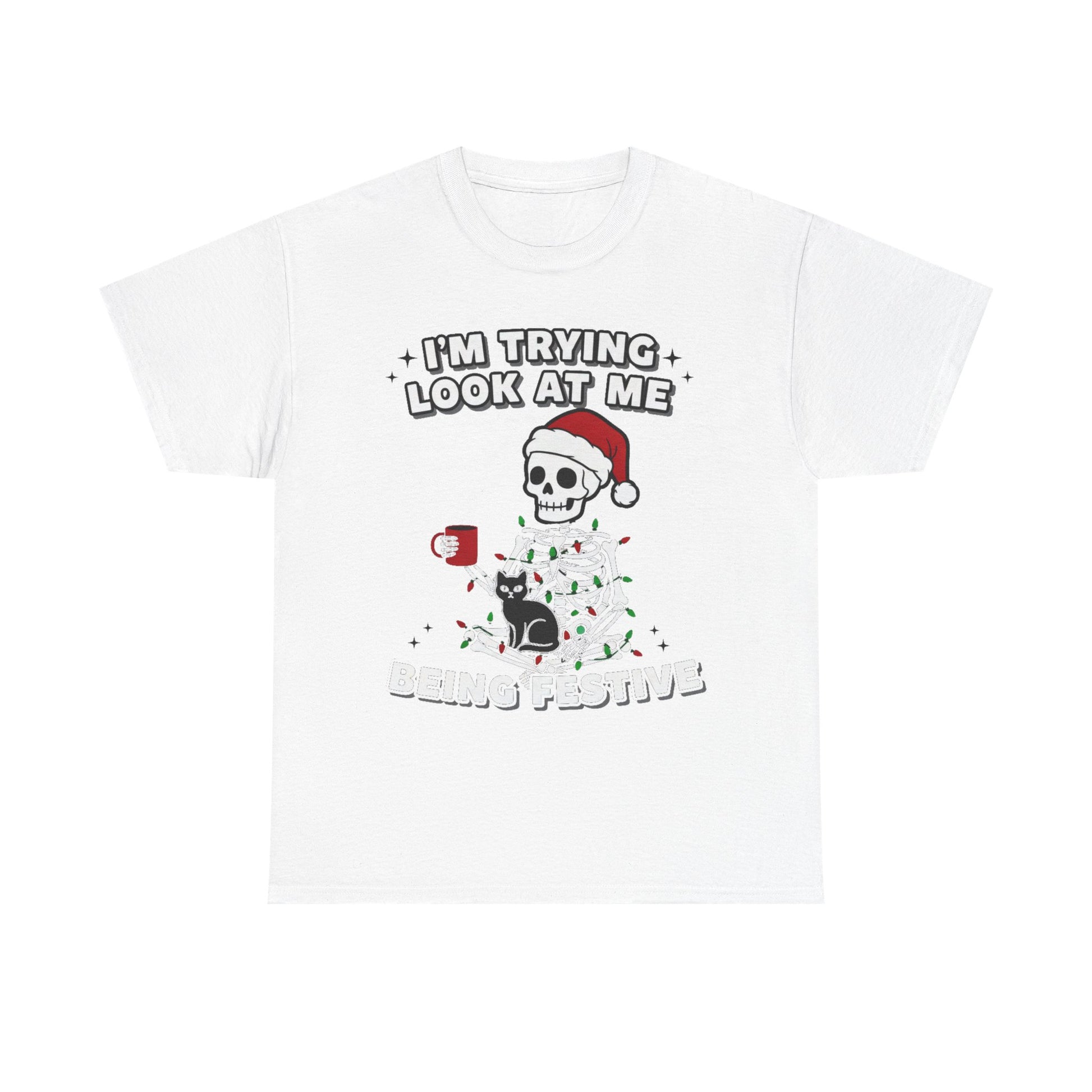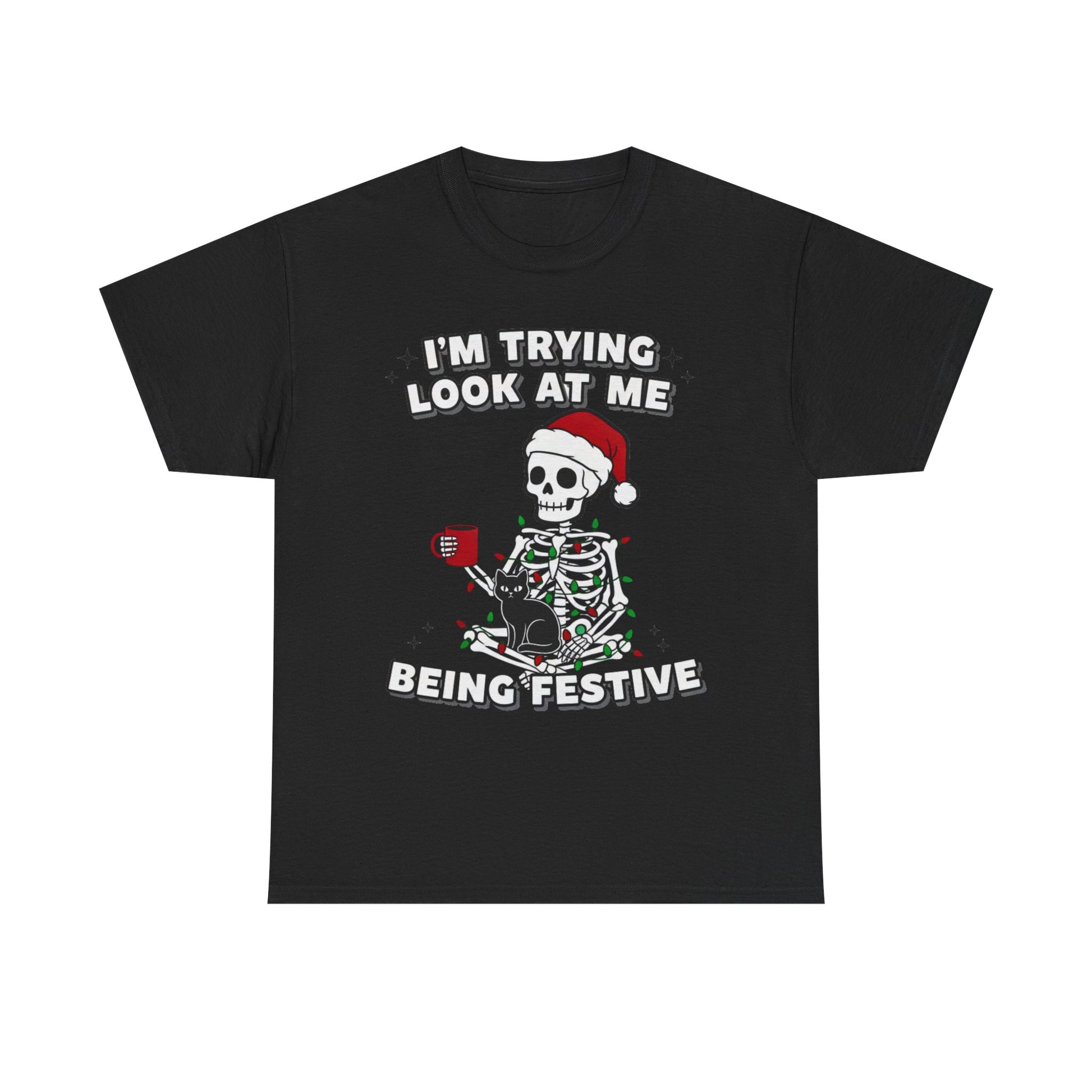 This festive Tee features a skeleton wrapped in Christmas lights wearing a Santa hat, perfect for spreading holiday cheer. Made from high-quality cotton, this Tee is comfortable and durable, suitable for adults. Ideal for those looking to add a fun and festive touch to their wardrobe during the holiday season.