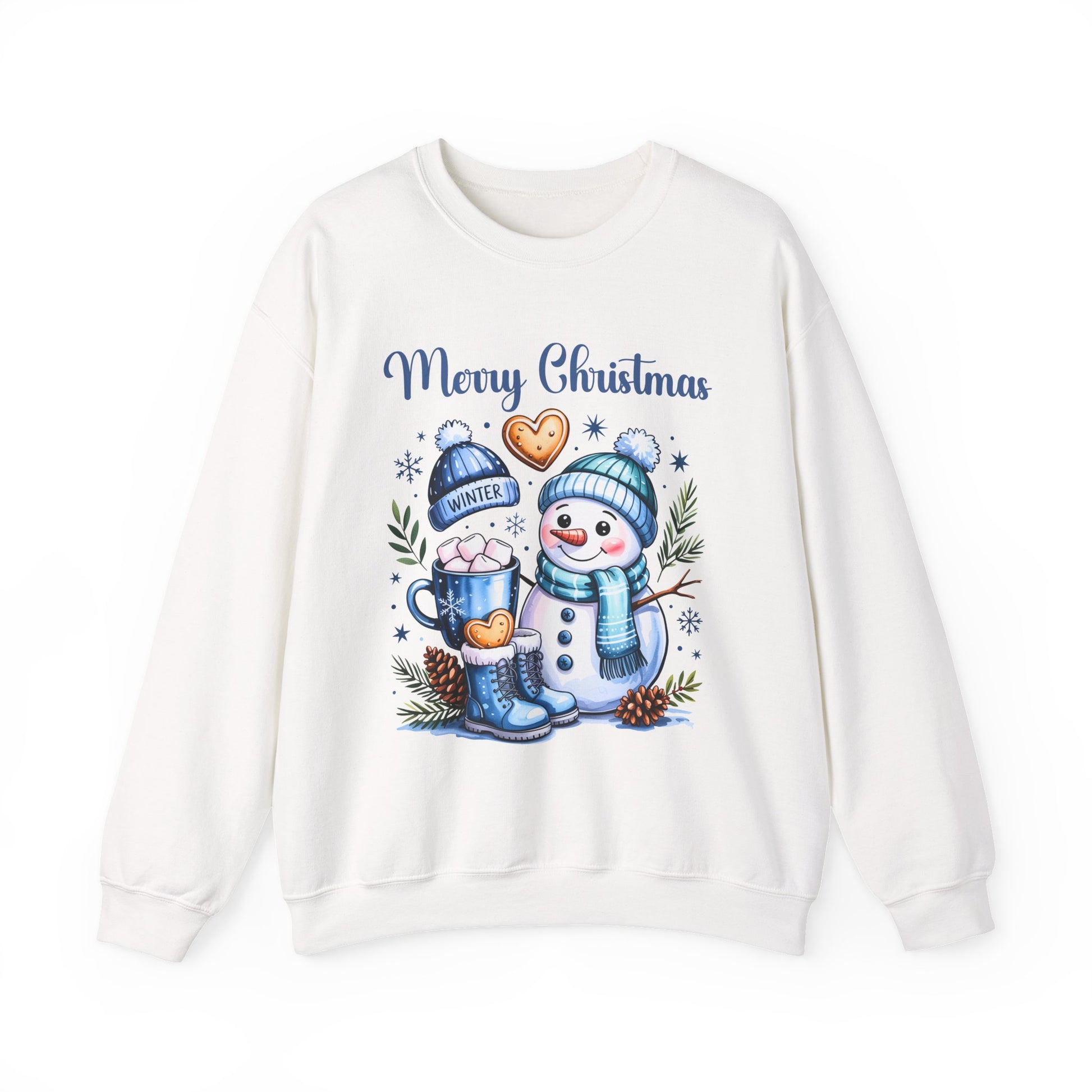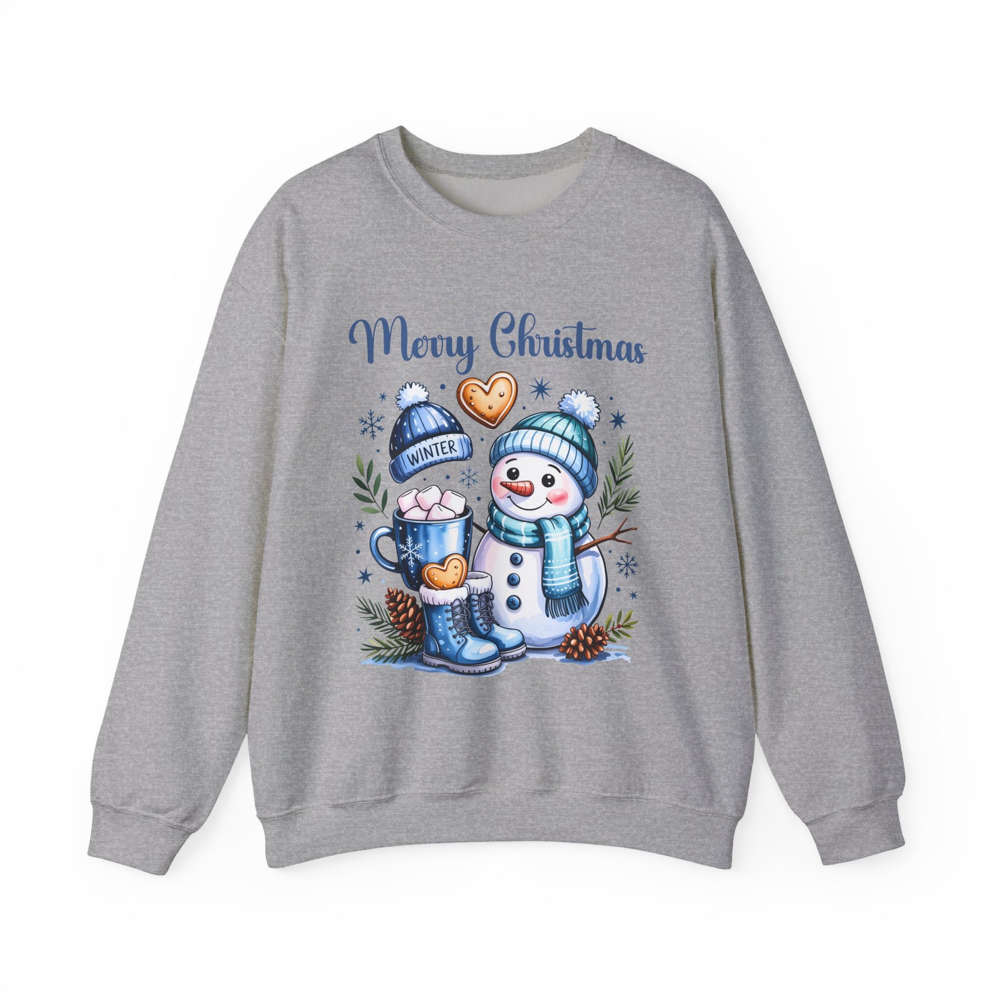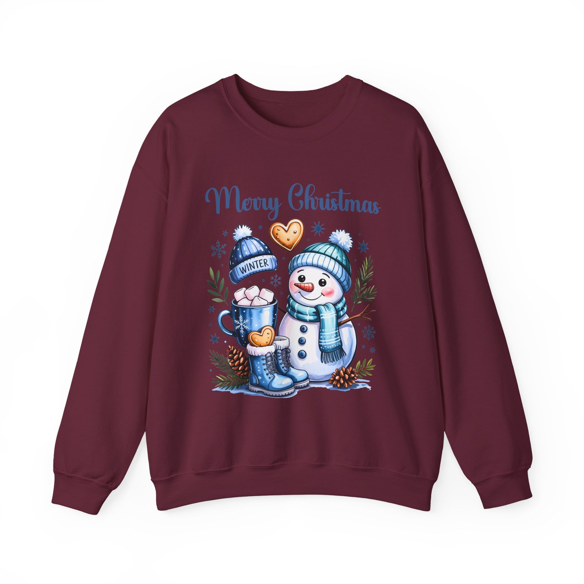 This Christmas-themed sweatshirt features a design with a snowman wearing a hat and scarf, a mug with marshmallows, cookies, a winter hat, and a winter boot. It gives off a cozy and festive vibe, perfect for wearing during the holiday season. Ideal for adults looking for a comfortable and durable sweatshirt to stay warm and stylish during Christmas celebrations.