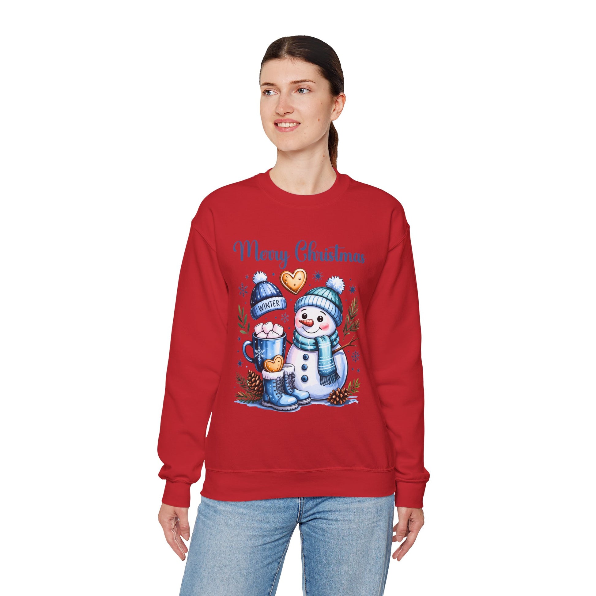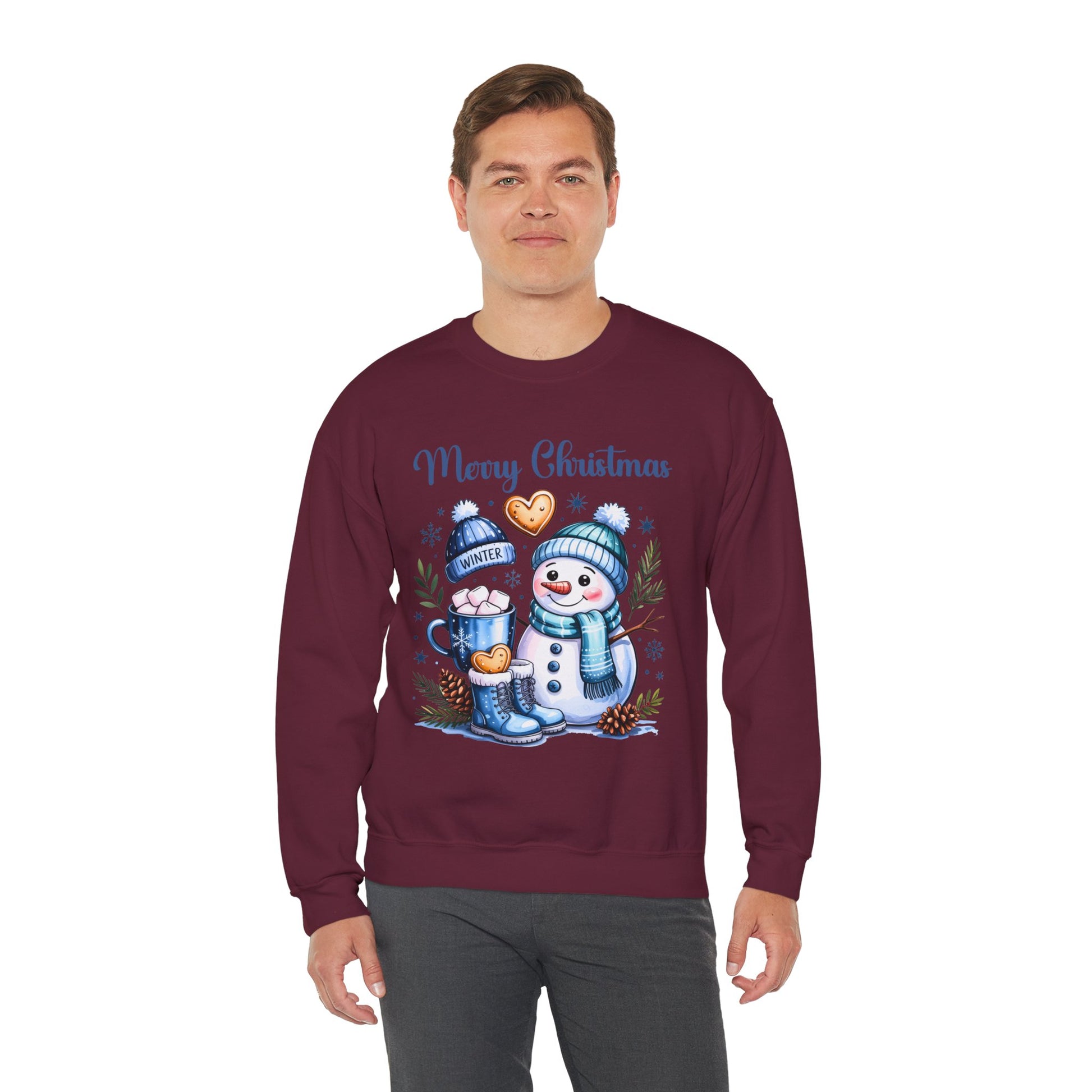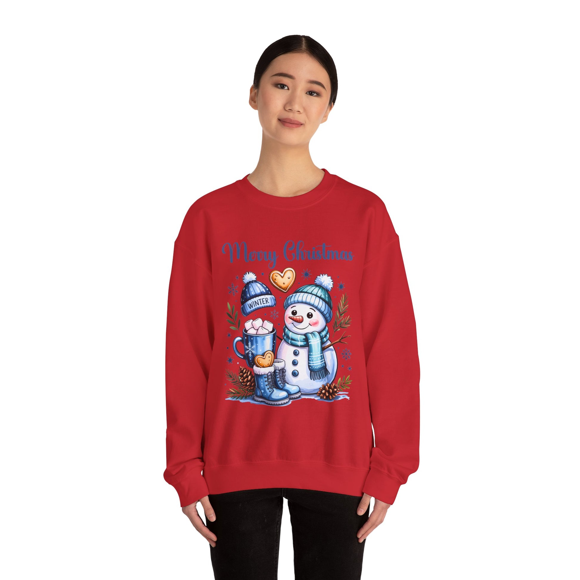 This Christmas-themed sweatshirt features a design with a snowman wearing a hat and scarf, a mug with marshmallows, cookies, a winter hat, and a winter boot. It gives off a cozy and festive vibe, perfect for wearing during the holiday season. Ideal for adults looking for a comfortable and durable sweatshirt to stay warm and stylish during Christmas celebrations.