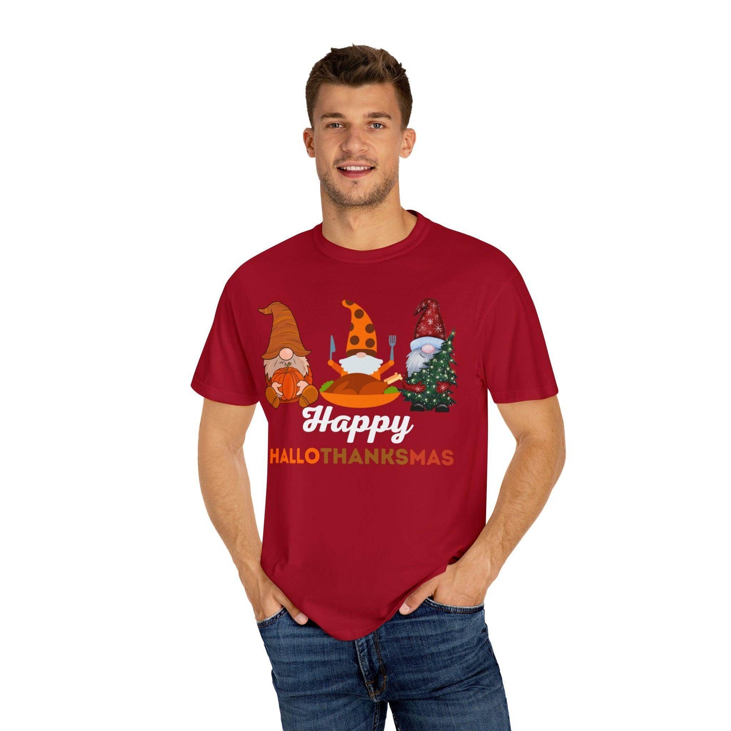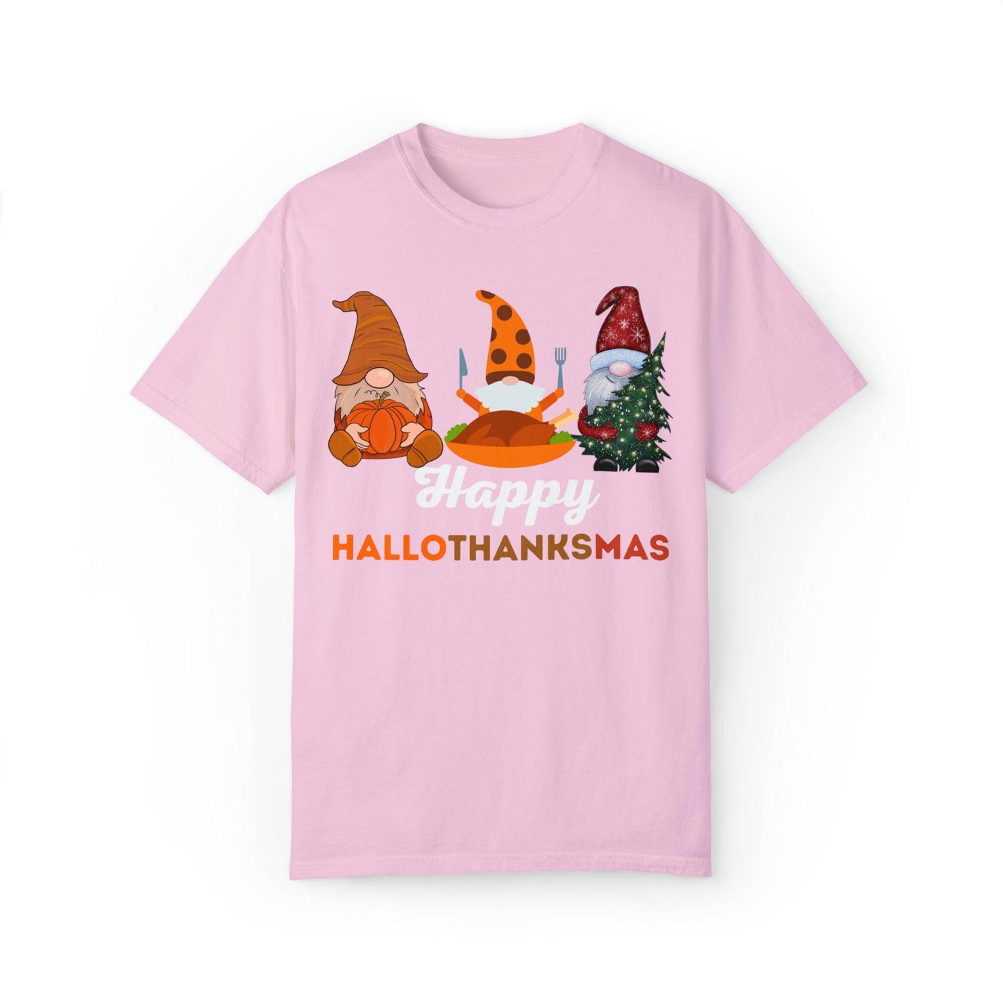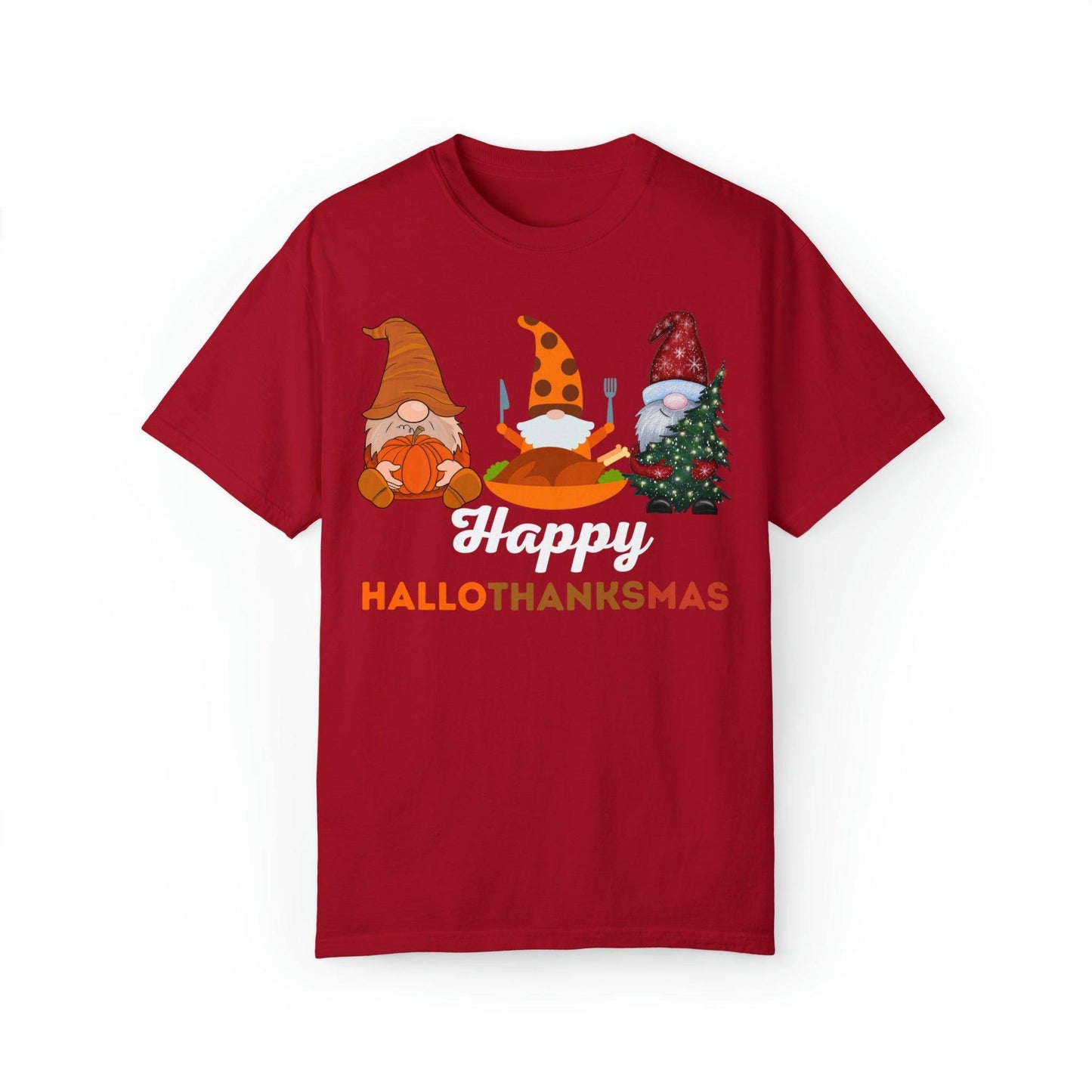 Introducing the "Happy HALLOTHANKSMAS" – the ultimate gift for those who adore the trifecta of fall, Halloween, Thanksgiving, and Christmas. With this unique and festive creation, you're not just getting a shirt; you're embracing a joyful blend of three beloved seasons in one. As the leaves change and the air gets cooler, you'll be ready to celebrate the spookiness of Halloween, the warmth of Thanksgiving, and the merriment of Christmas, all with a single piece of clothing.