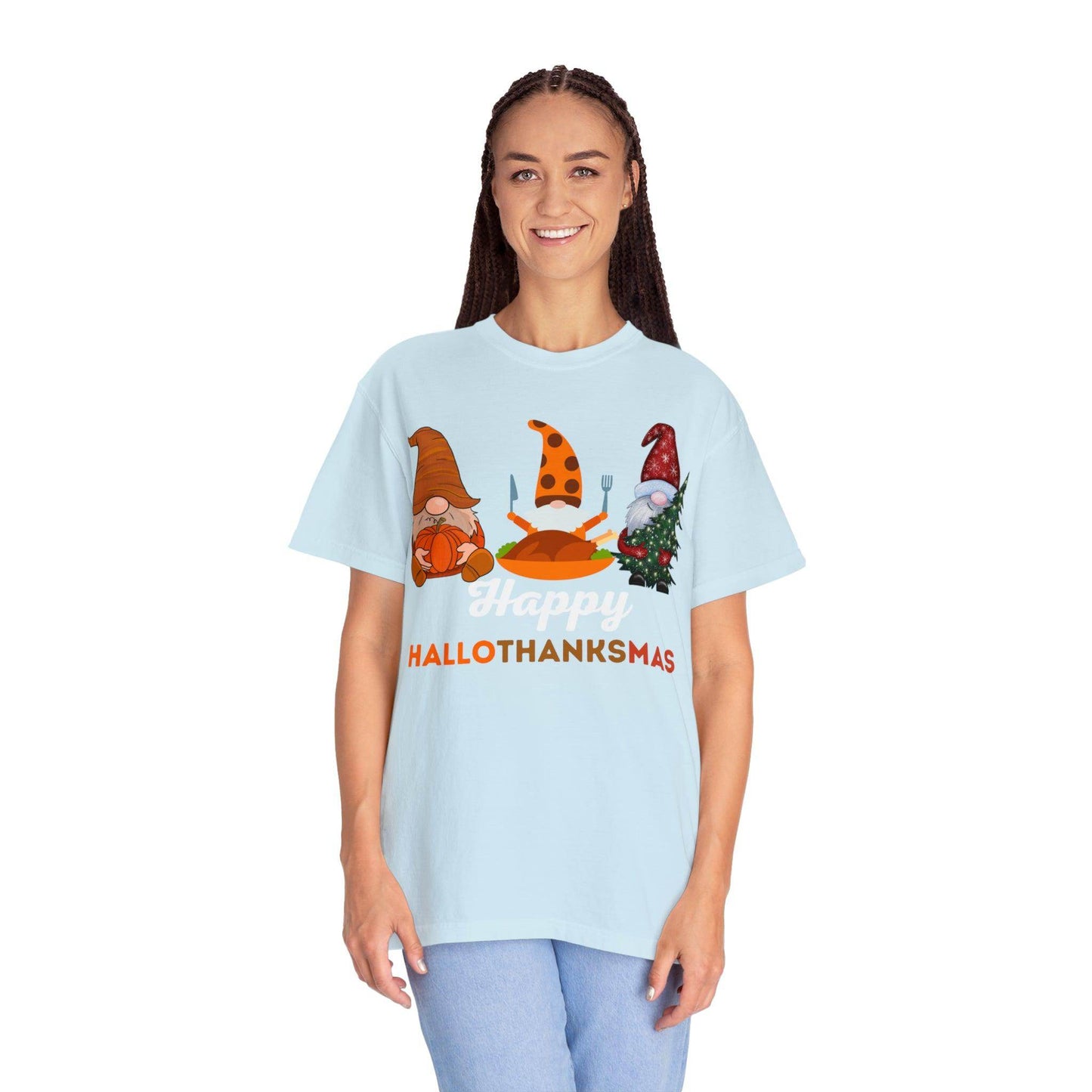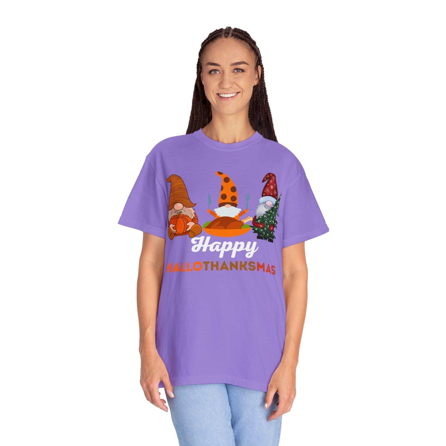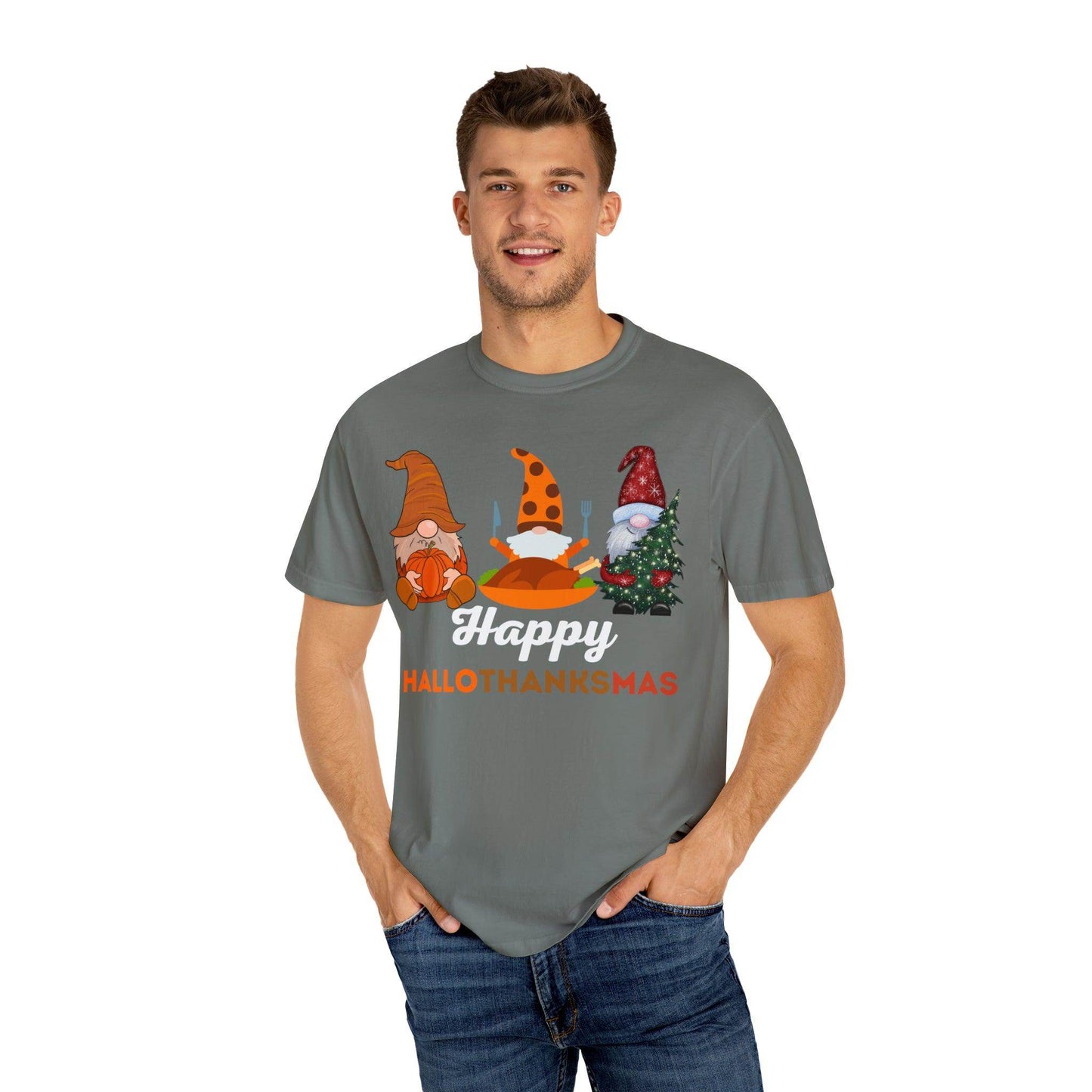 Introducing the "Happy HALLOTHANKSMAS" – the ultimate gift for those who adore the trifecta of fall, Halloween, Thanksgiving, and Christmas. With this unique and festive creation, you're not just getting a shirt; you're embracing a joyful blend of three beloved seasons in one. As the leaves change and the air gets cooler, you'll be ready to celebrate the spookiness of Halloween, the warmth of Thanksgiving, and the merriment of Christmas, all with a single piece of clothing.