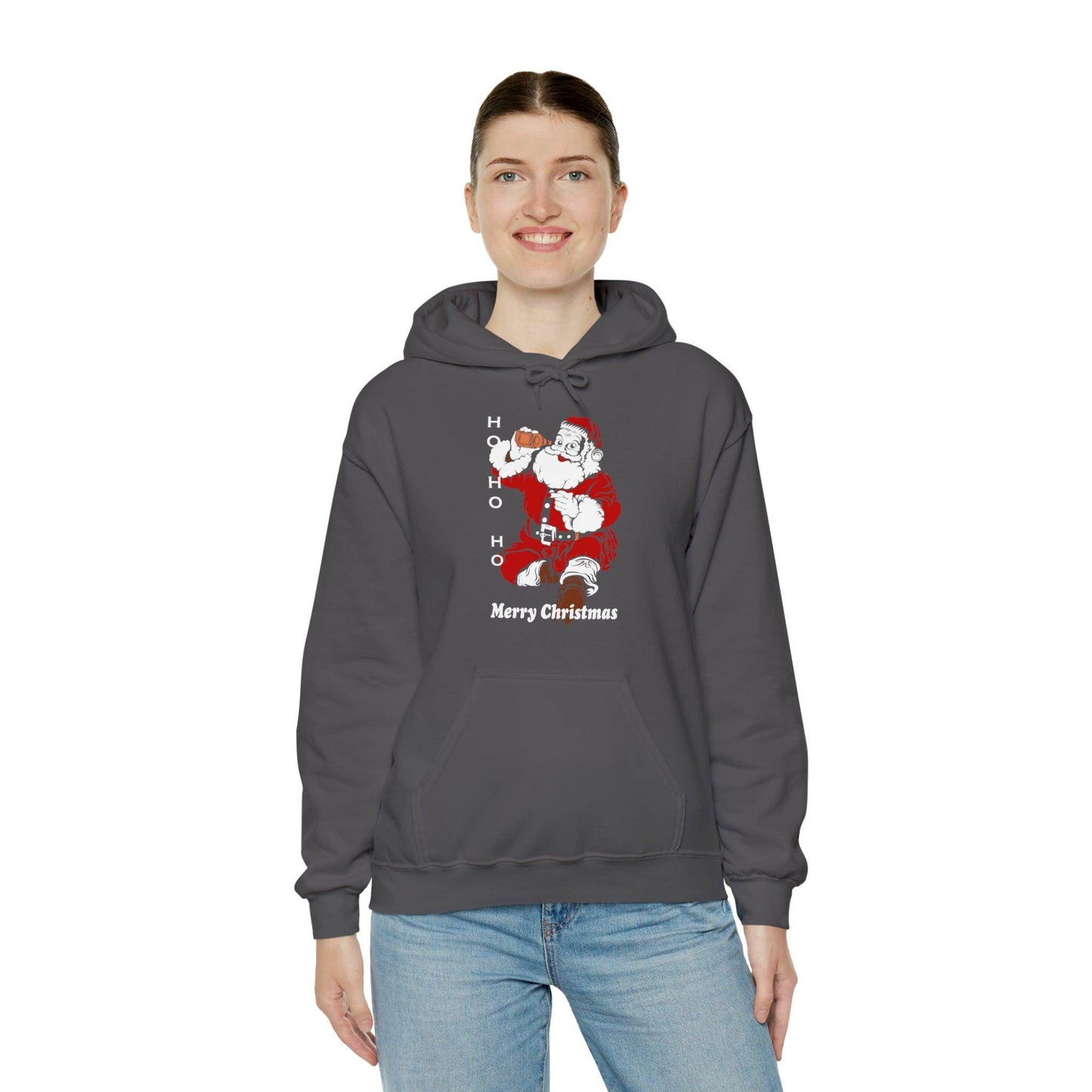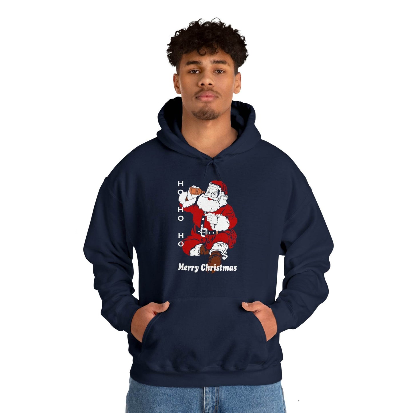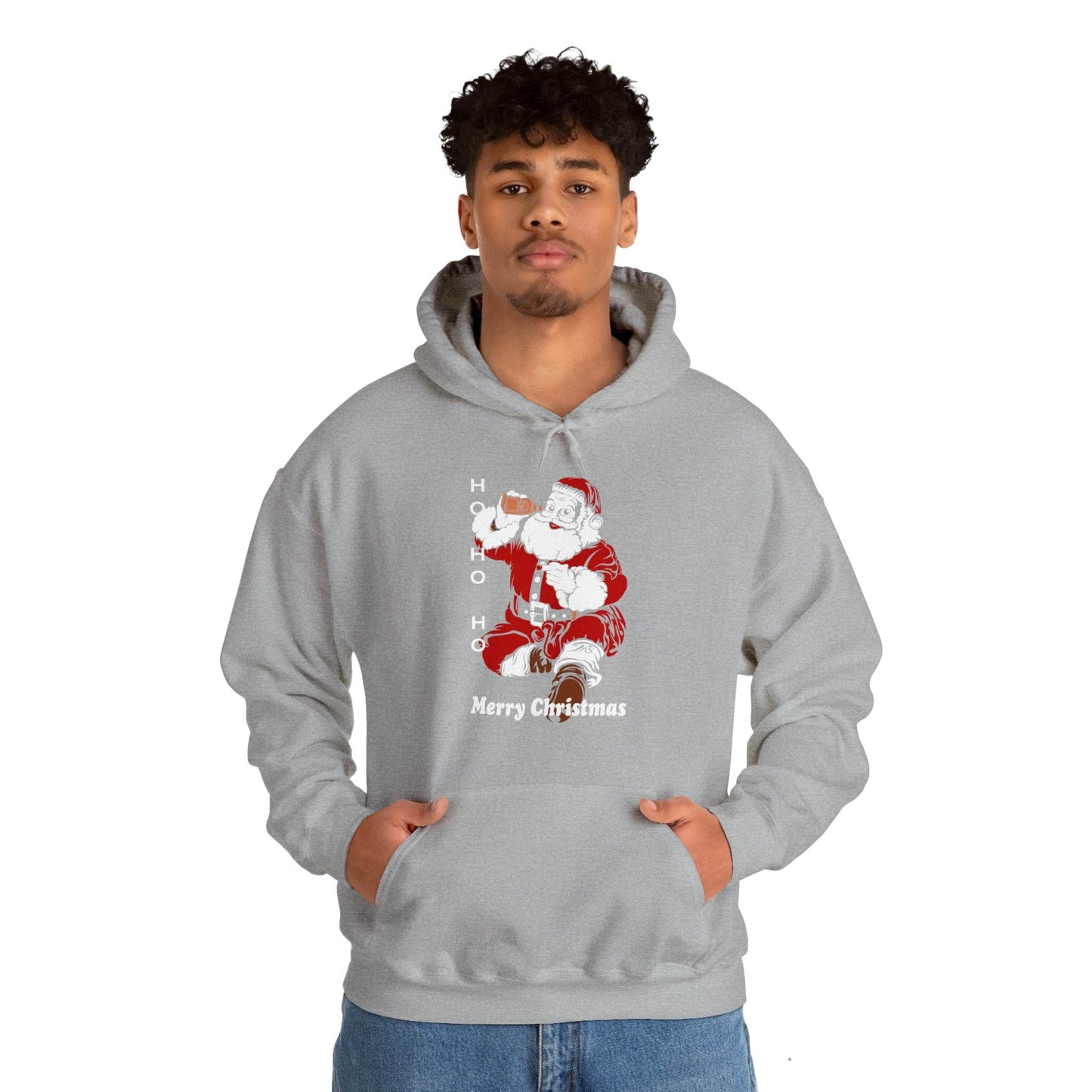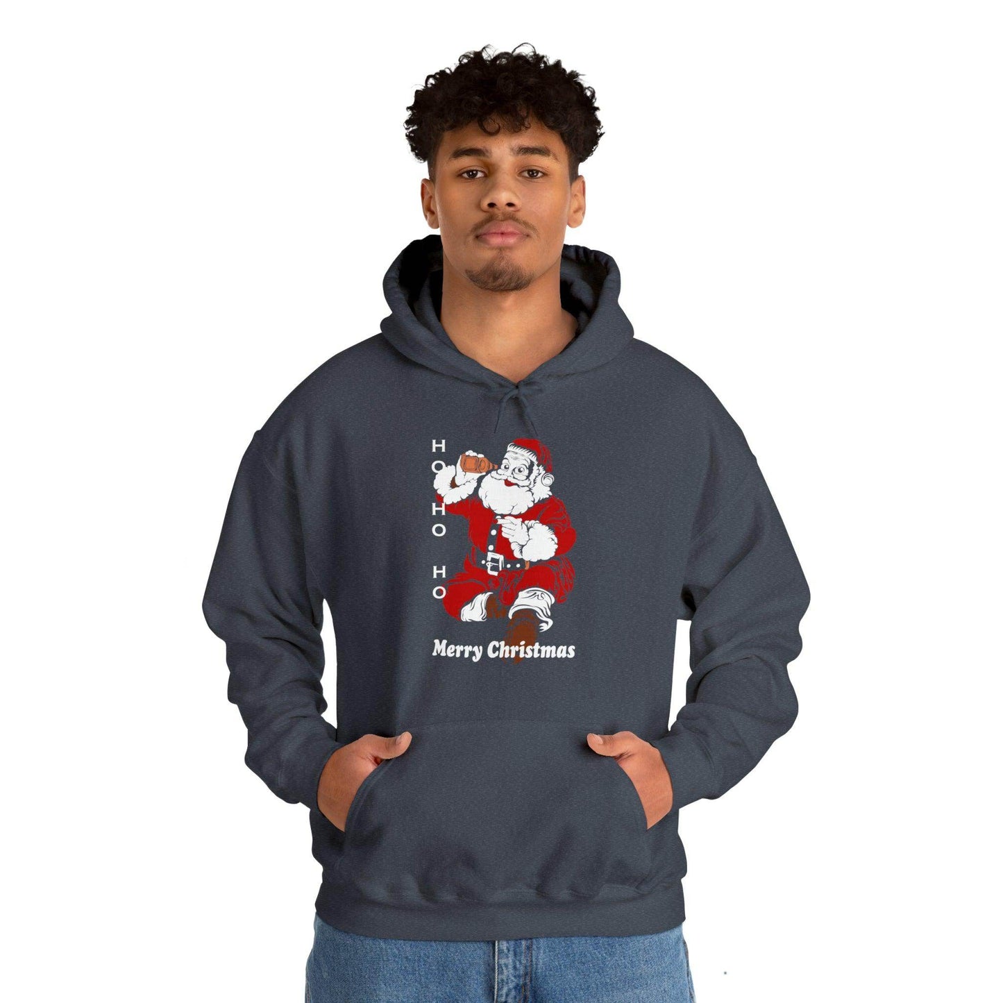 Ho Ho Ho Merry Christmas with Santa hooded sweatshirt. This unisex heavy blend hooded sweatshirt is relaxation itself. Made with a thick blend of cotton and polyester, it feels plush, soft and warm, a perfect choice for any cold day. In the front, the spacious kangaroo pocket adds daily practicality while the hood's drawstring is the same color as the base sweater for extra style points.