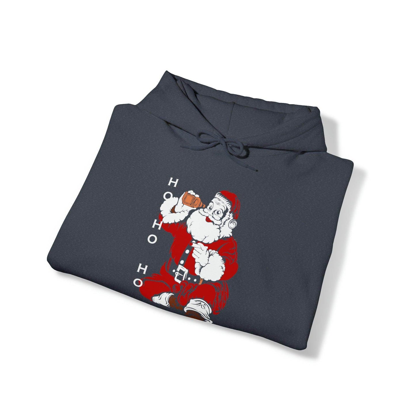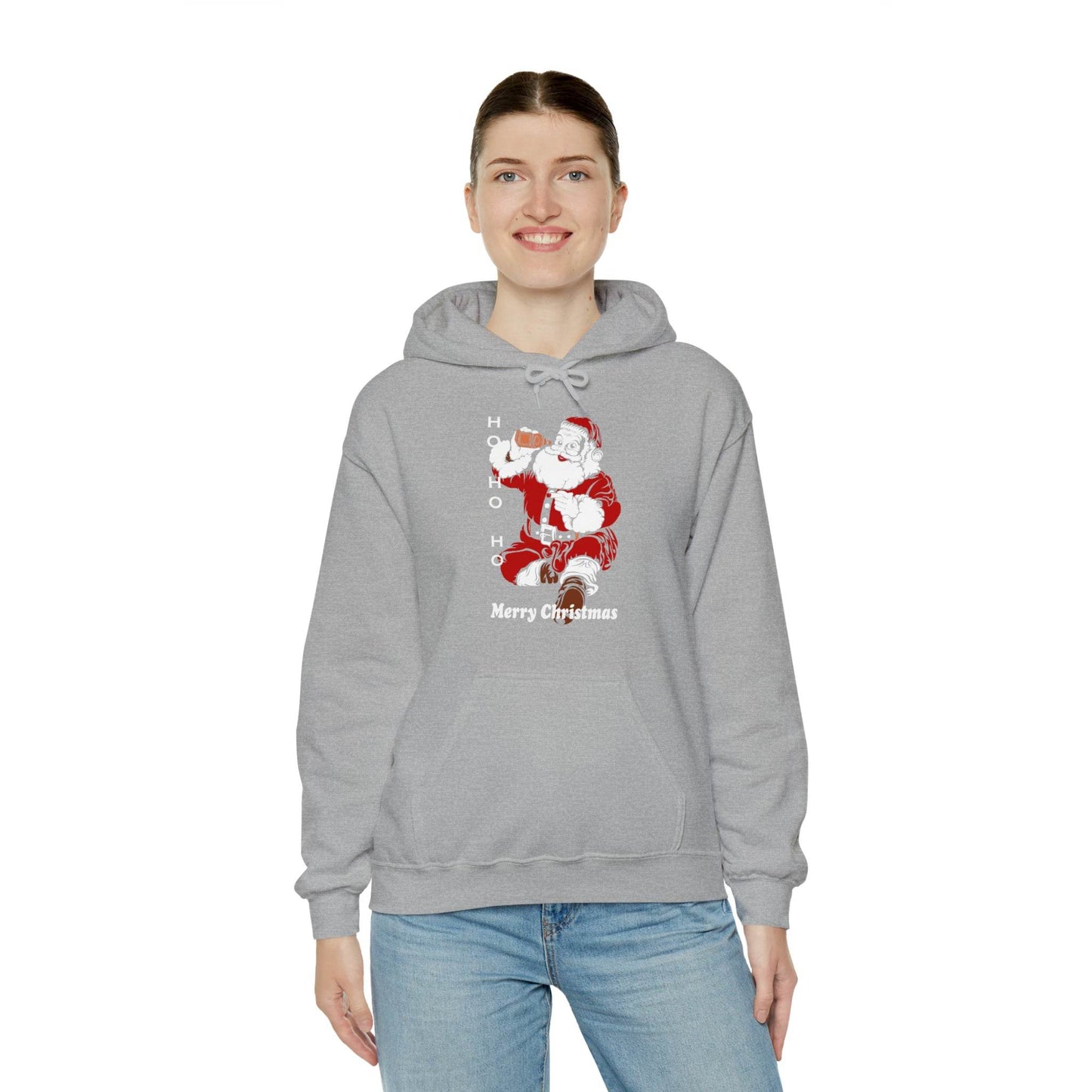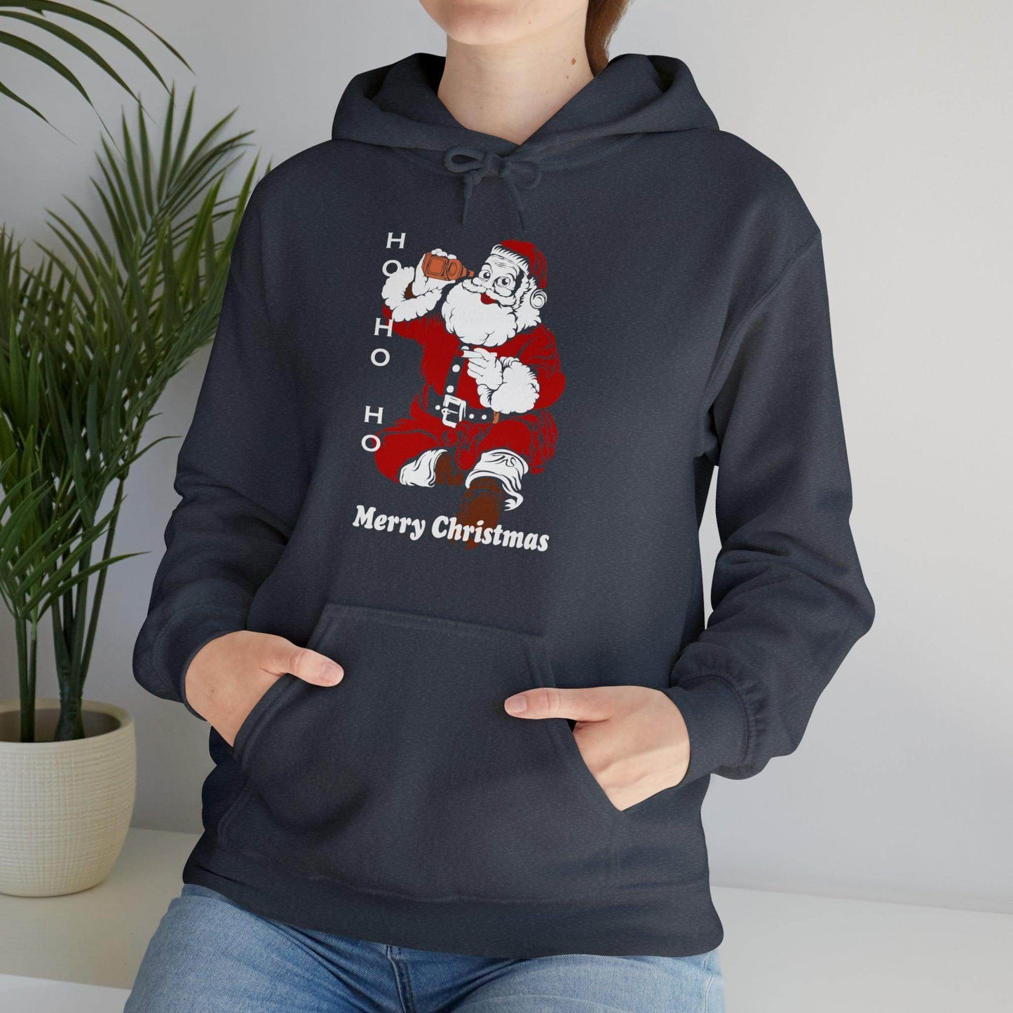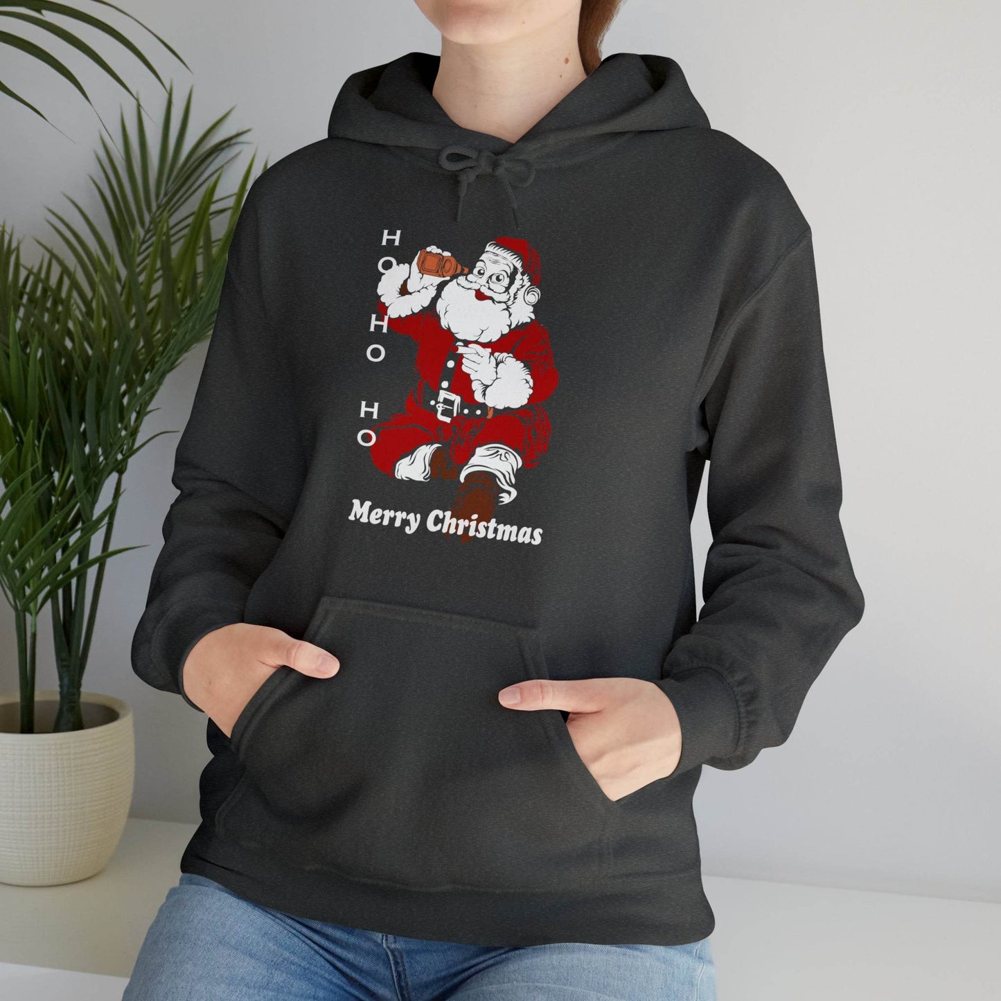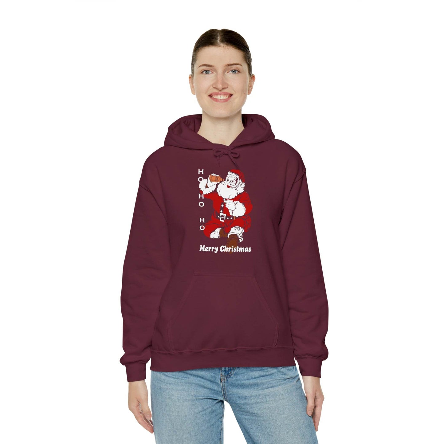 Ho Ho Ho Merry Christmas with Santa hooded sweatshirt. This unisex heavy blend hooded sweatshirt is relaxation itself. Made with a thick blend of cotton and polyester, it feels plush, soft and warm, a perfect choice for any cold day. In the front, the spacious kangaroo pocket adds daily practicality while the hood's drawstring is the same color as the base sweater for extra style points.