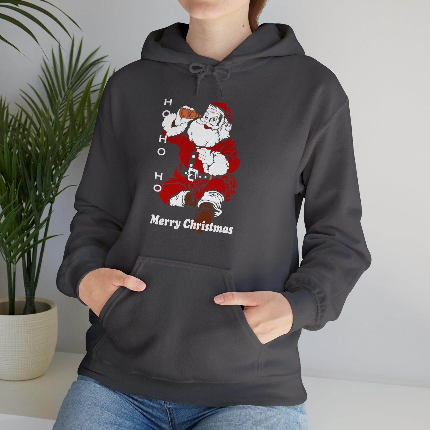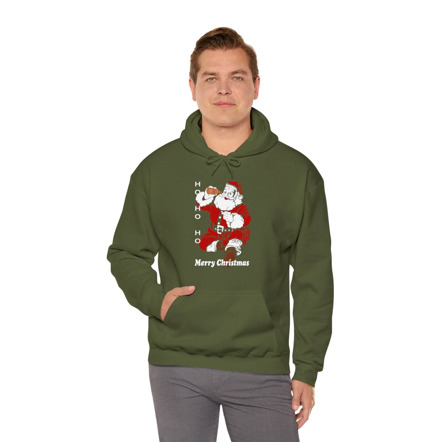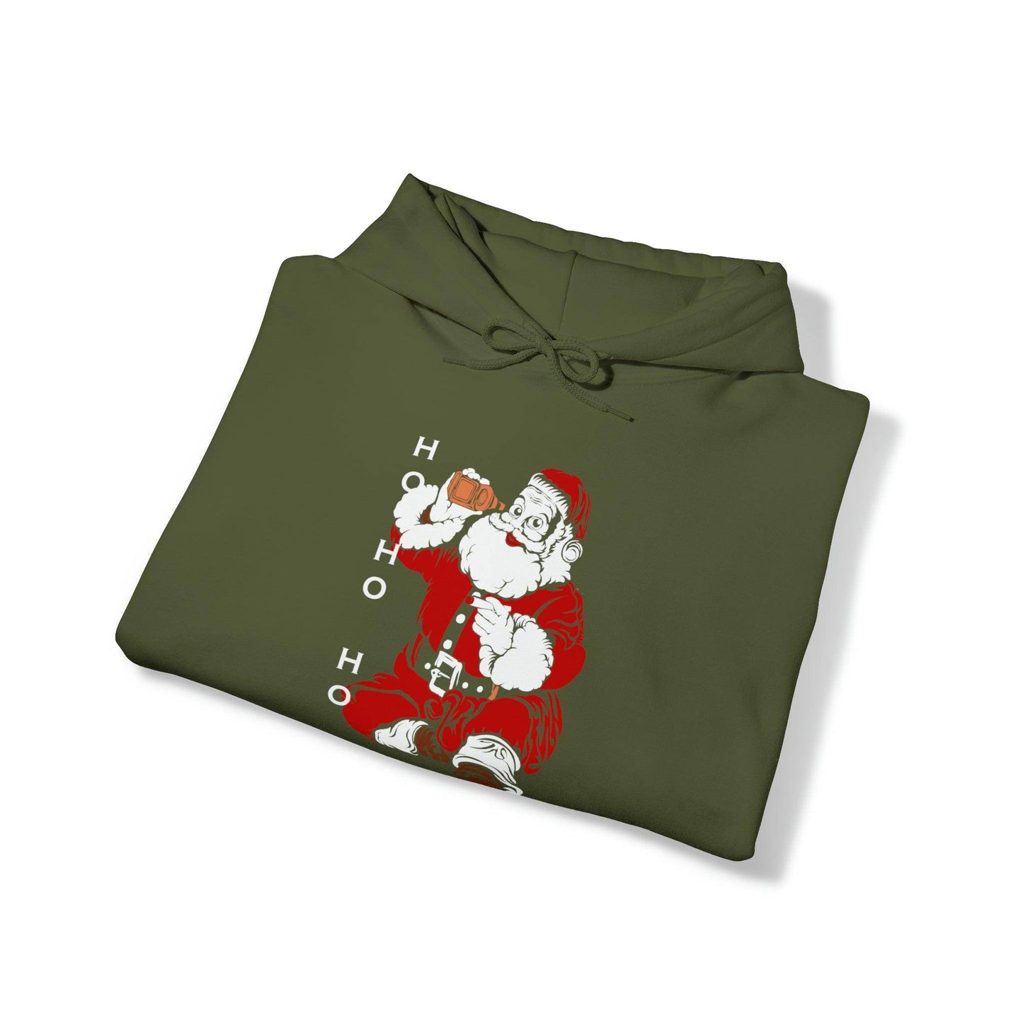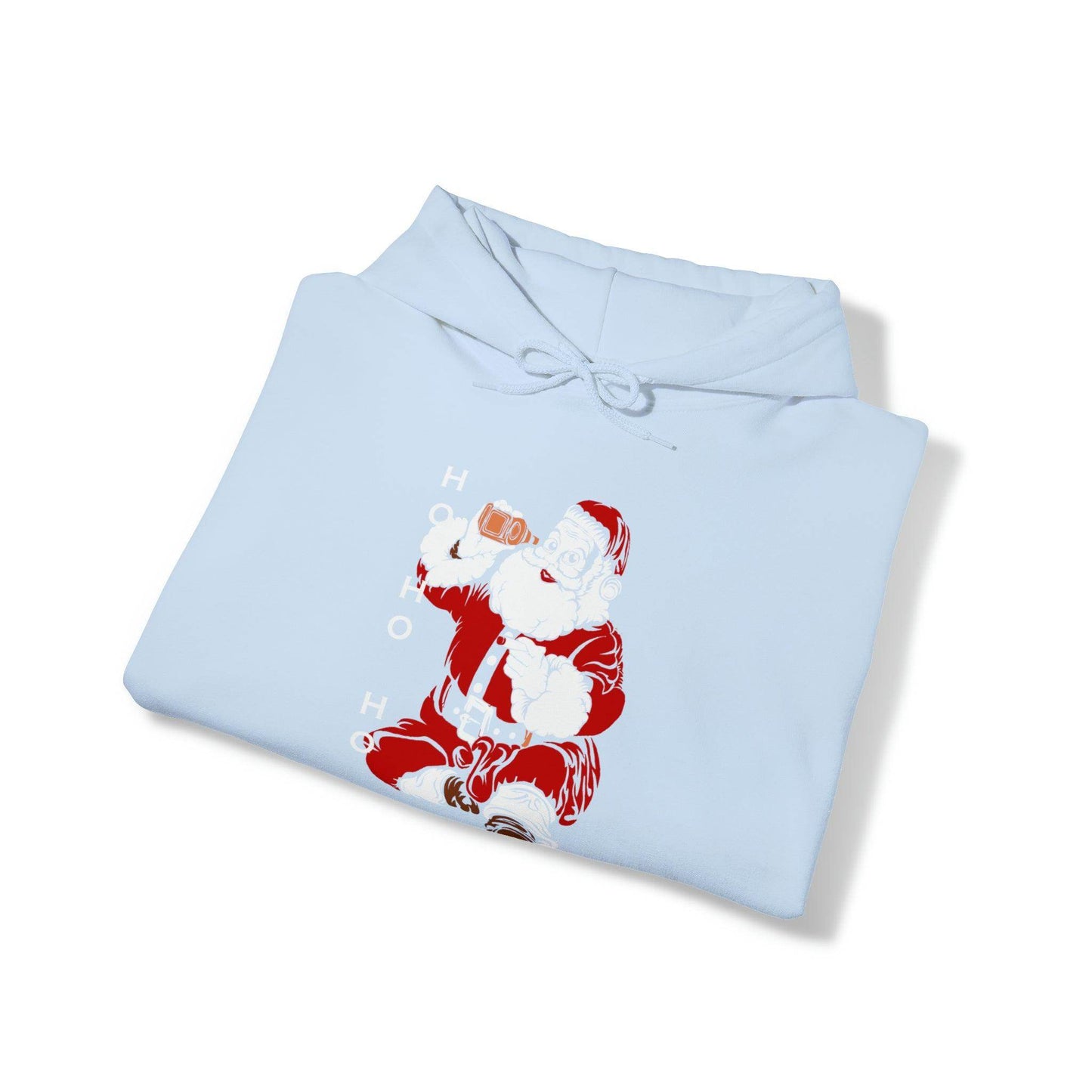 Ho Ho Ho Merry Christmas with Santa hooded sweatshirt. This unisex heavy blend hooded sweatshirt is relaxation itself. Made with a thick blend of cotton and polyester, it feels plush, soft and warm, a perfect choice for any cold day. In the front, the spacious kangaroo pocket adds daily practicality while the hood's drawstring is the same color as the base sweater for extra style points.