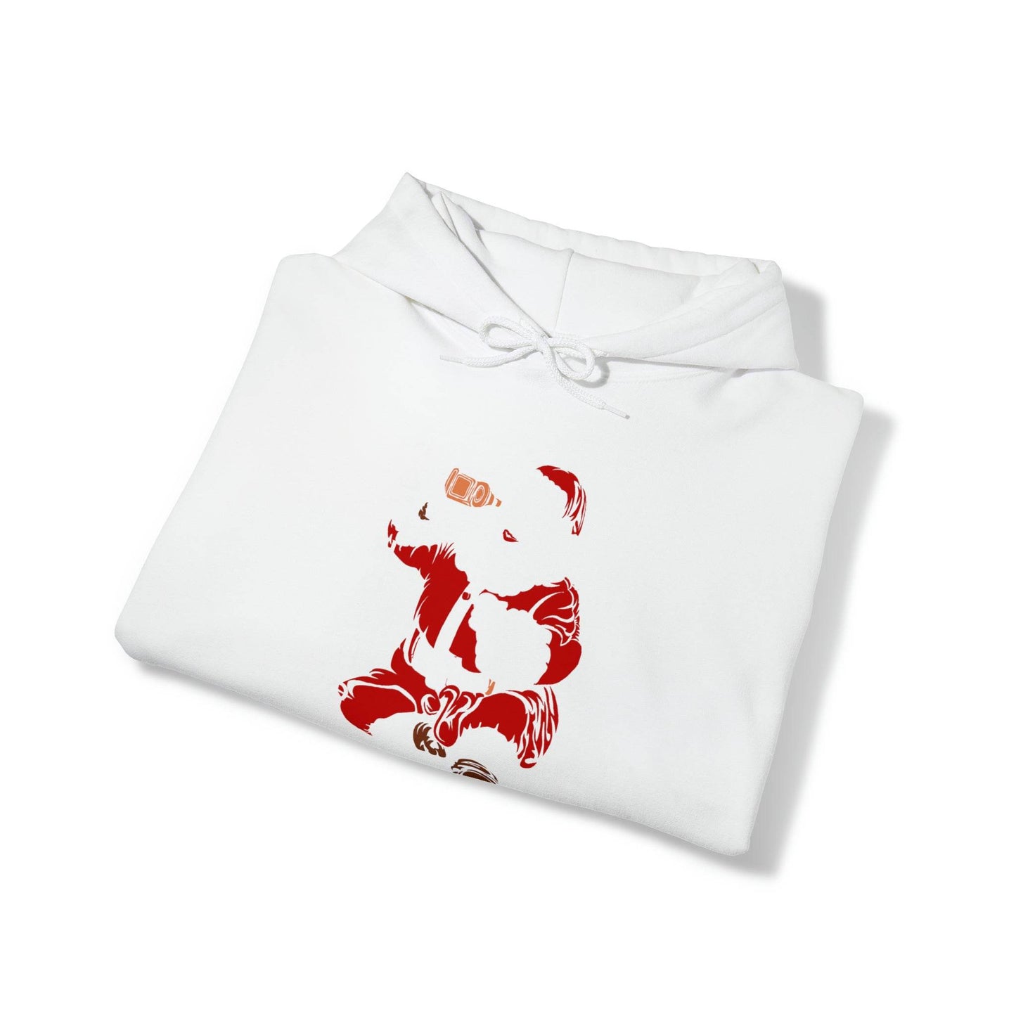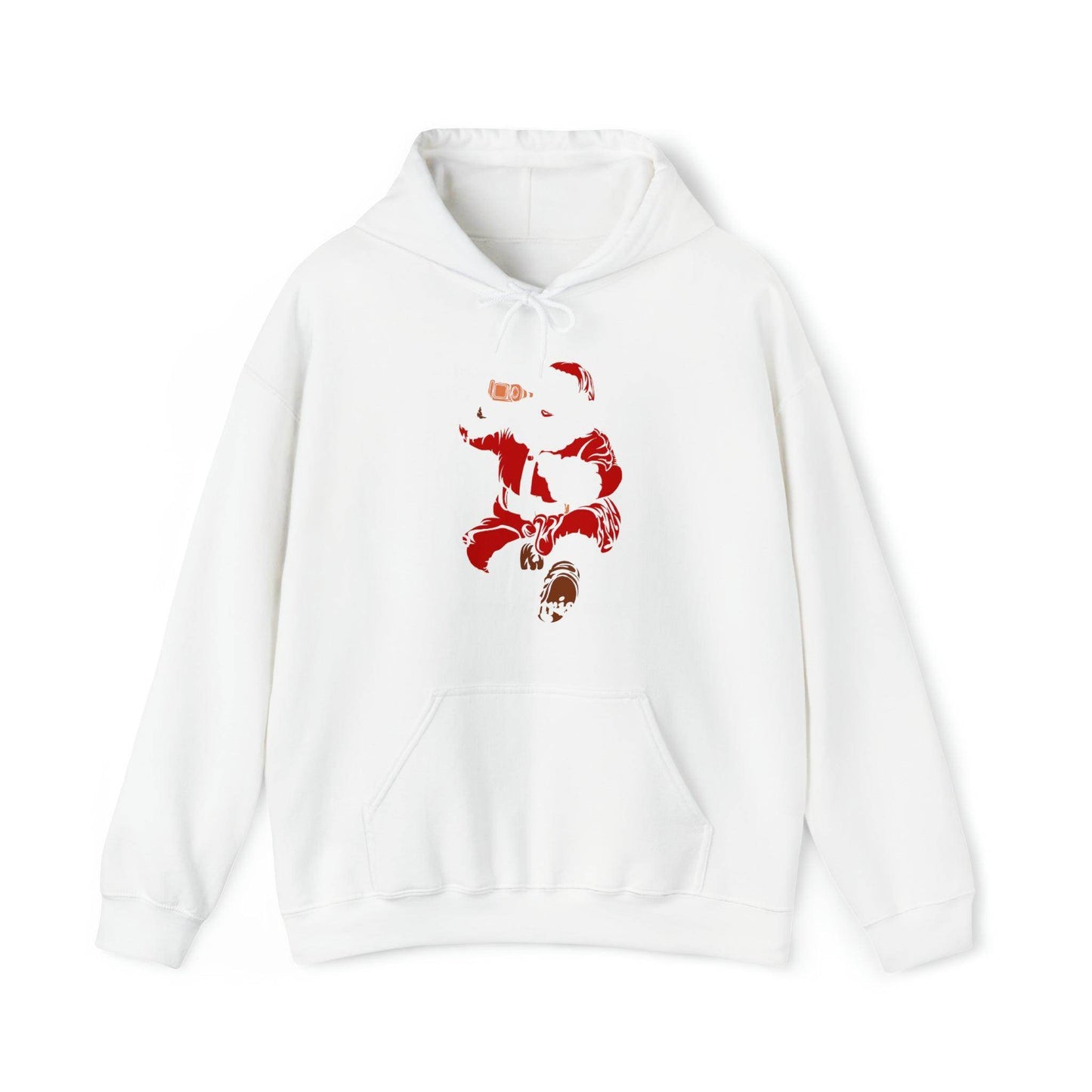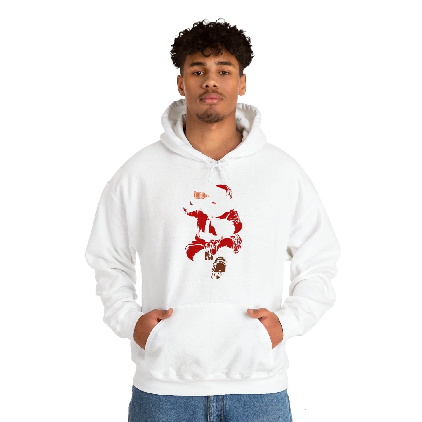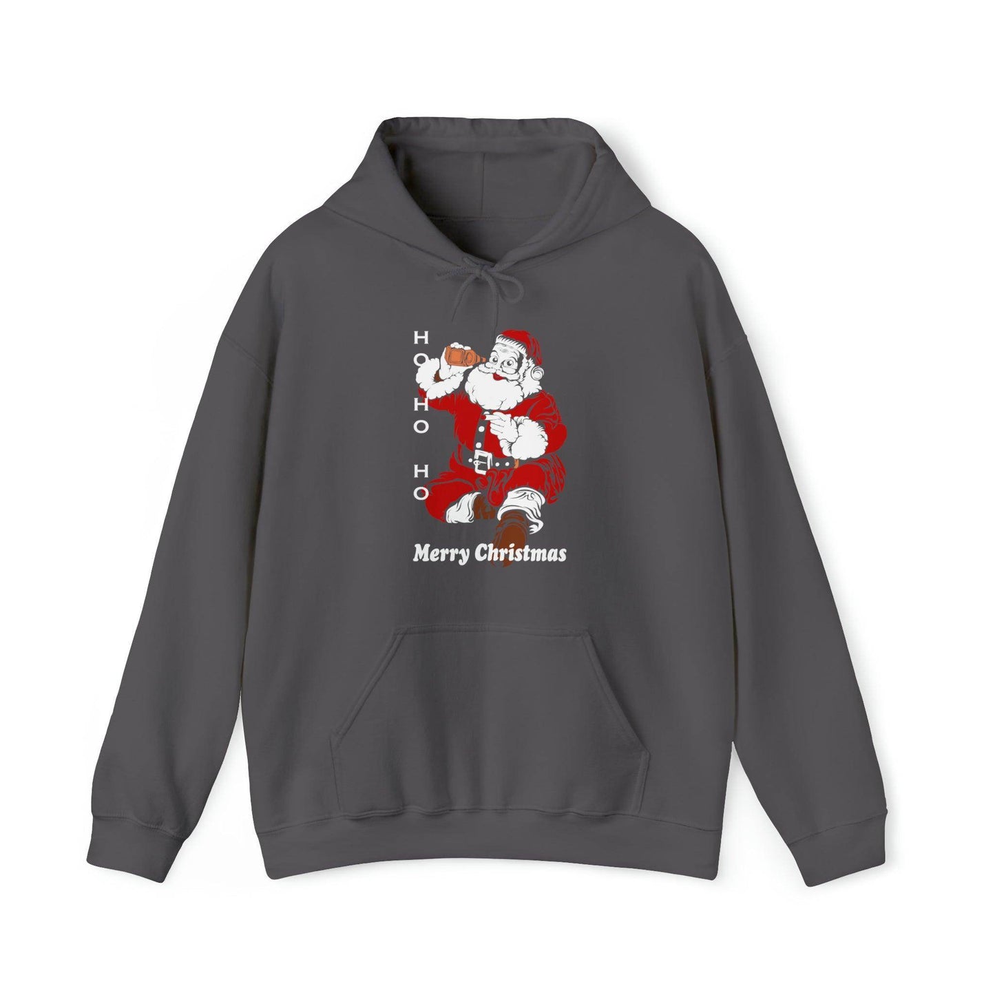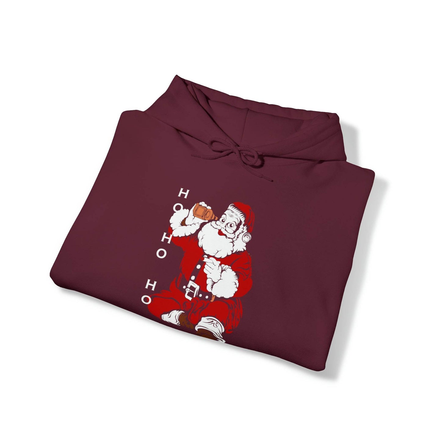 Ho Ho Ho Merry Christmas with Santa hooded sweatshirt. This unisex heavy blend hooded sweatshirt is relaxation itself. Made with a thick blend of cotton and polyester, it feels plush, soft and warm, a perfect choice for any cold day. In the front, the spacious kangaroo pocket adds daily practicality while the hood's drawstring is the same color as the base sweater for extra style points.