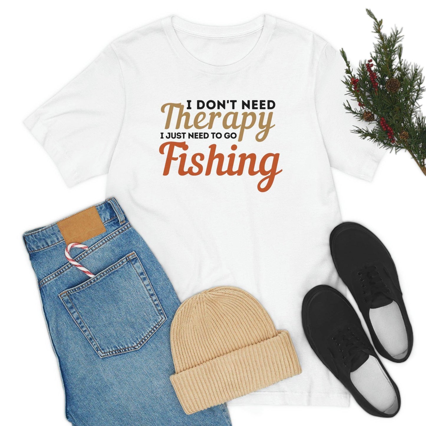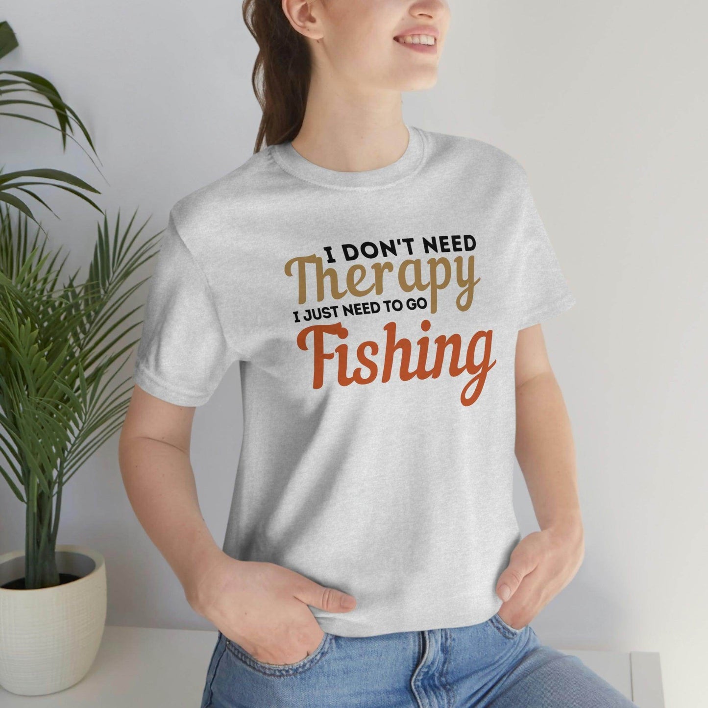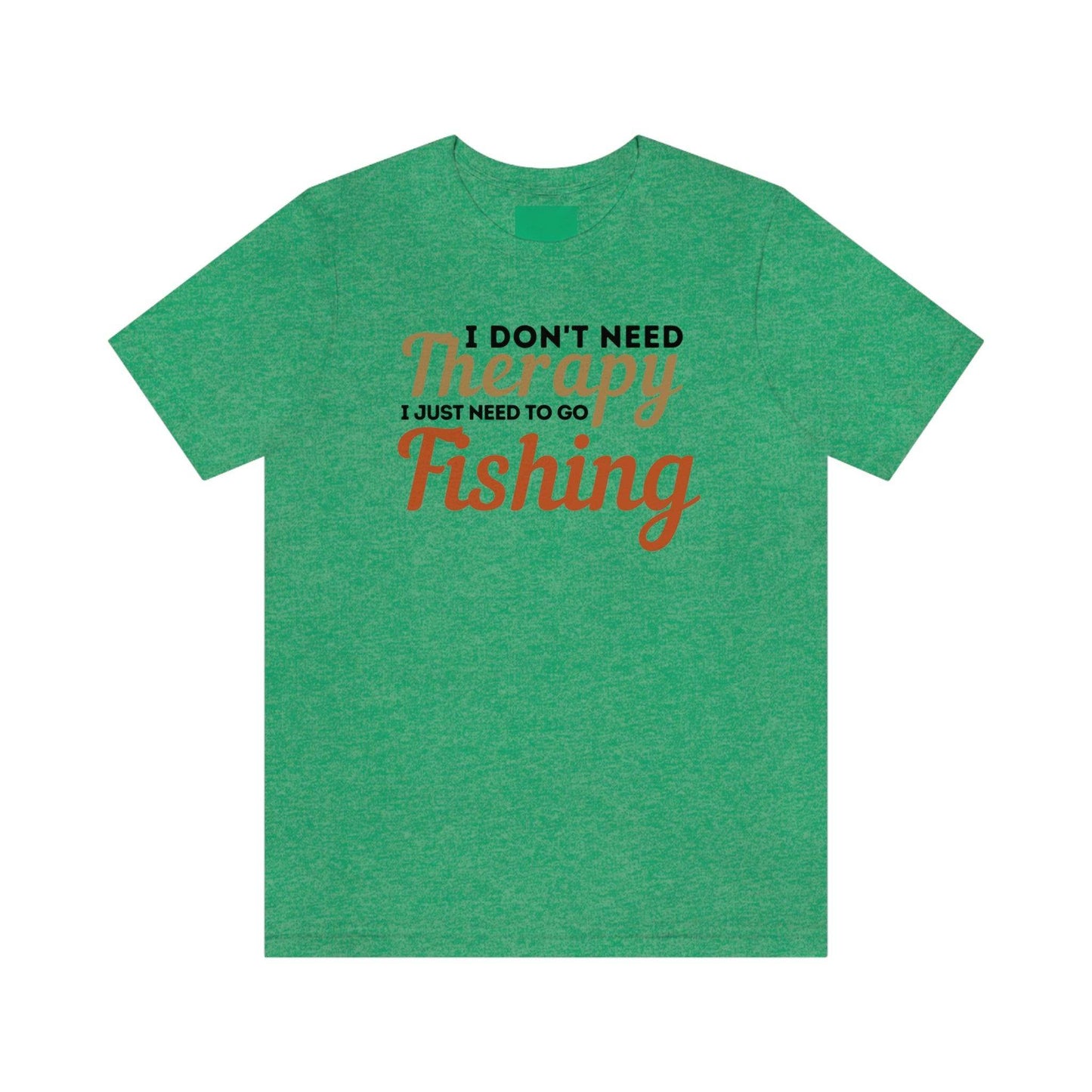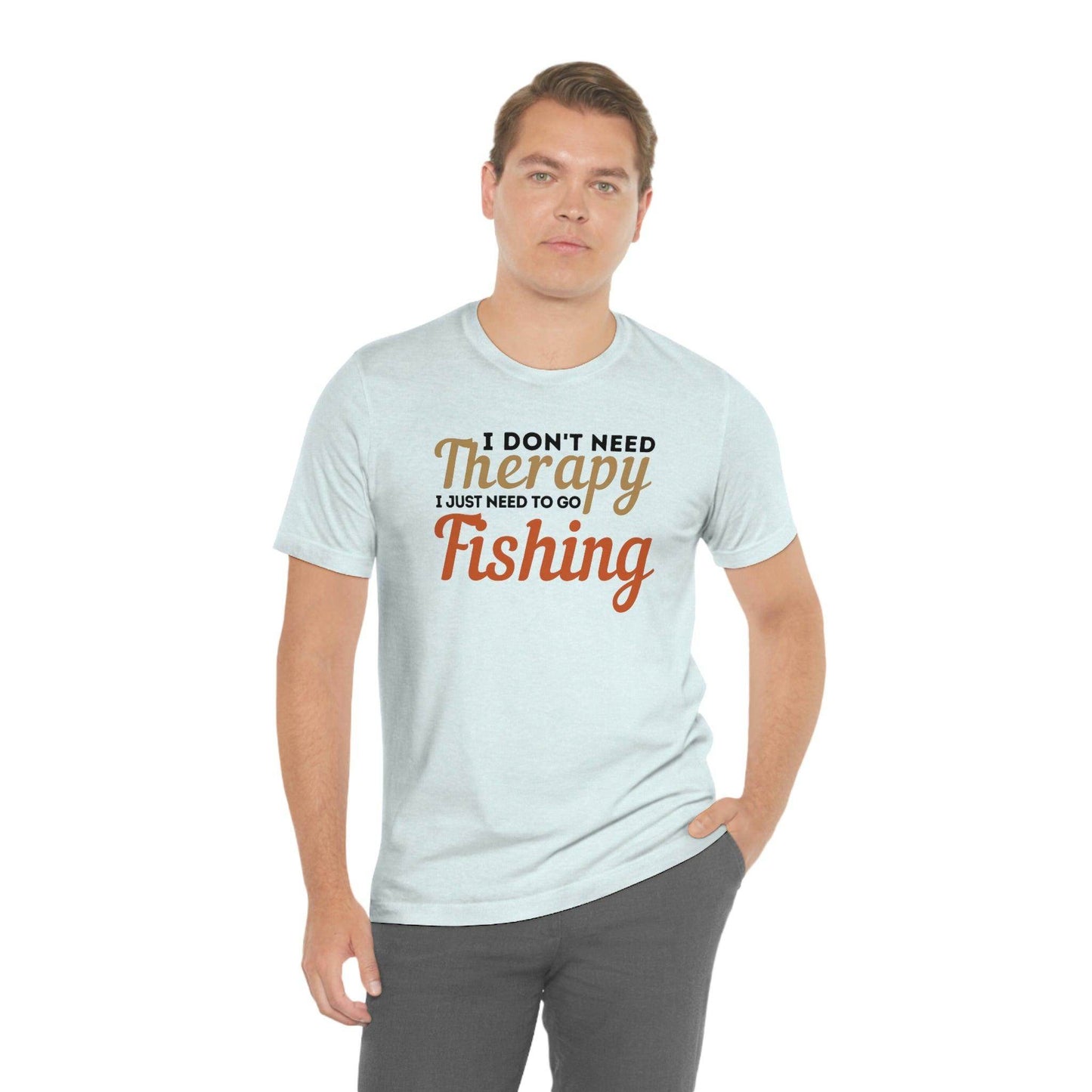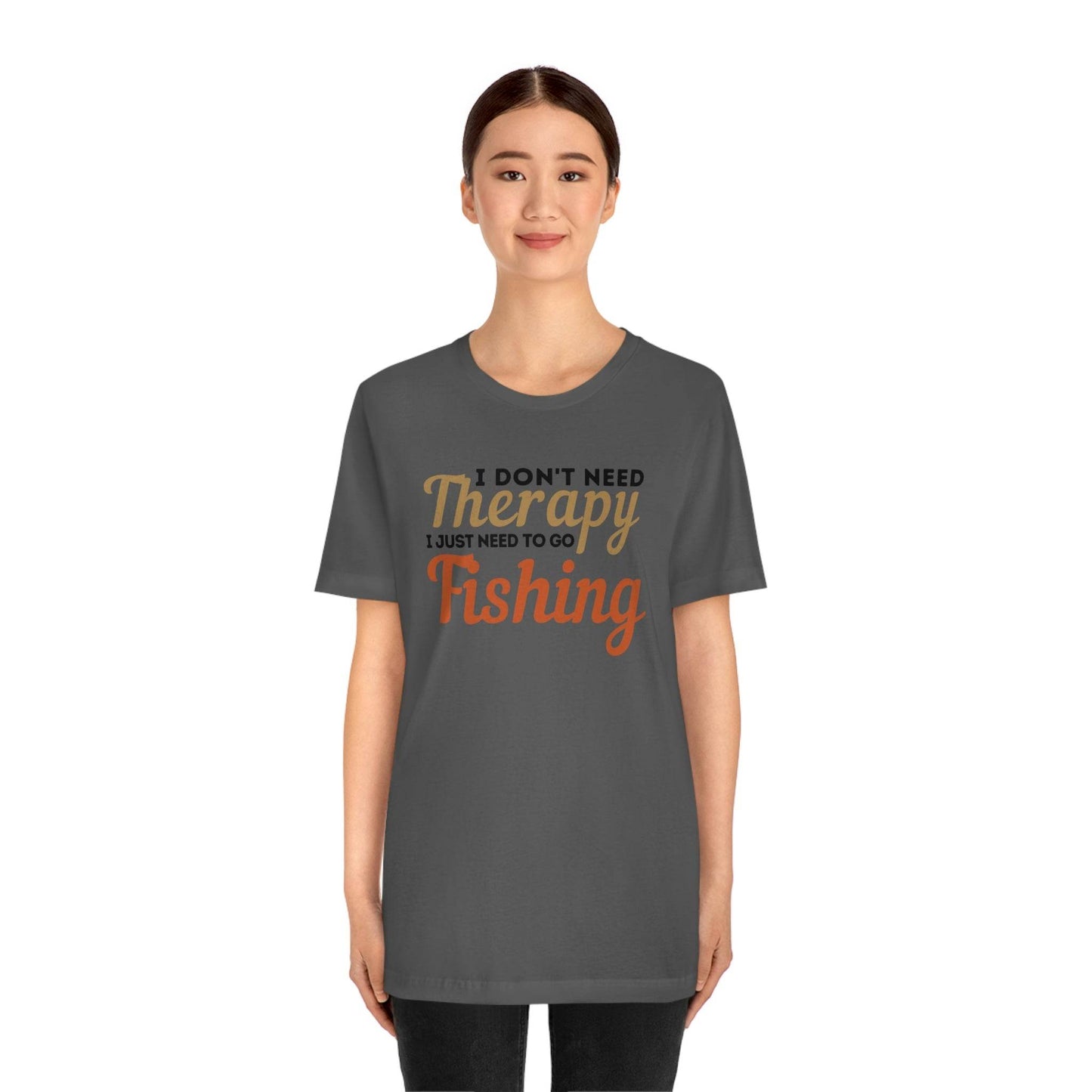 I don't need therapy I just need to go Fishing. This classic unisex jersey short sleeve tee fits like a well-loved favorite. Soft cotton and quality print make users fall in love with it over and over again. These t-shirts have-ribbed knit collars to bolster shaping. The shoulders have taping for better fit over time. Dual side seams hold the garment's shape for longer.