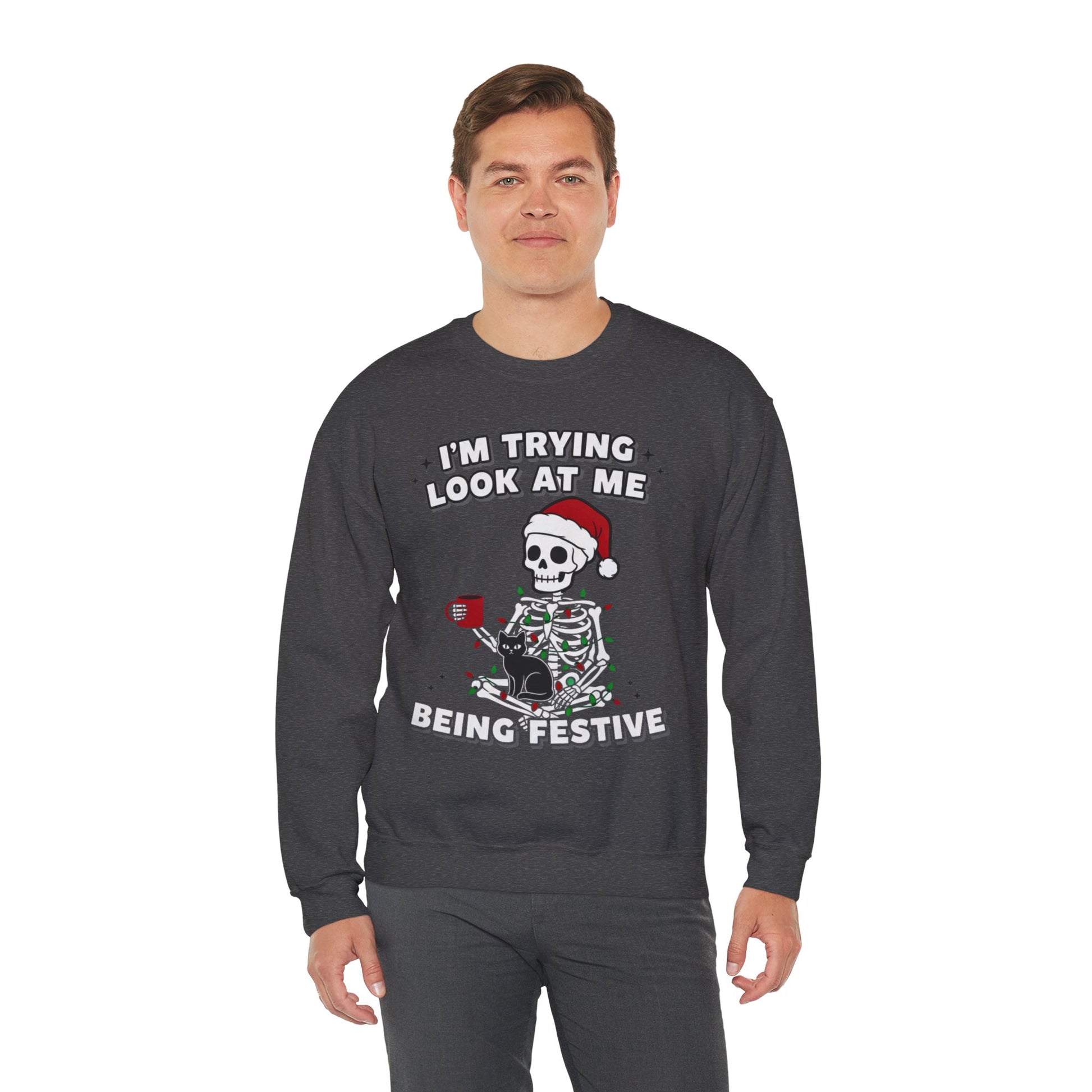 Turn holiday humor up a notch with our unisex skeleton Christmas sweatshirt—a cheeky skeleton in a Santa hat announcing “I’m trying—look at me being…” (phrase appears on the artwork as shown in photos). Soft, warm, and photo-friendly, it’s a crowd-pleaser for parties, exchanges, school events, and relaxed movie nights.