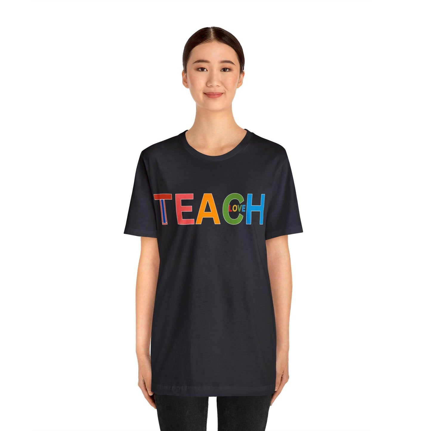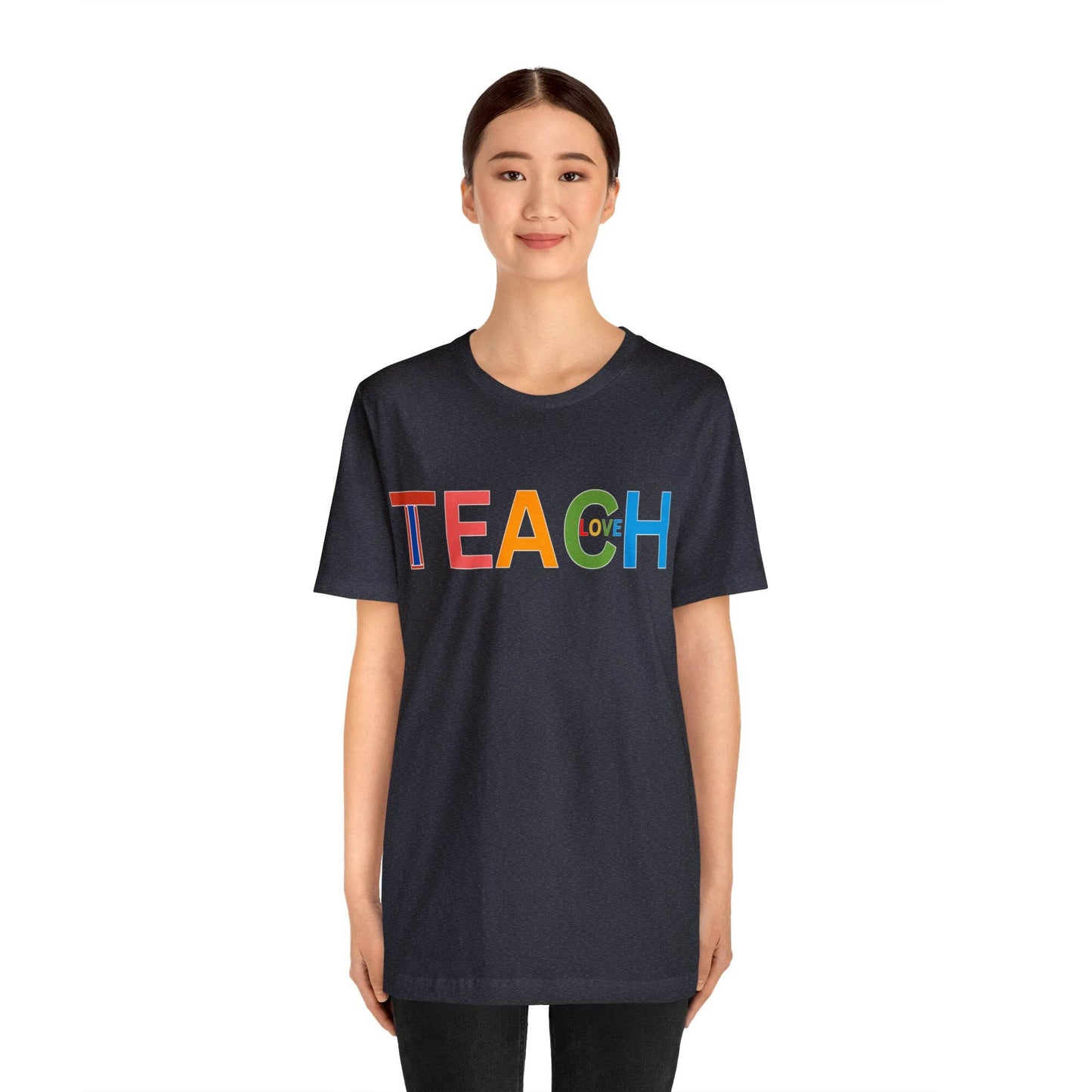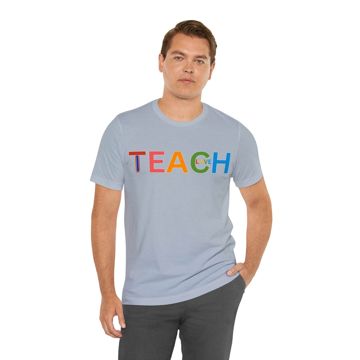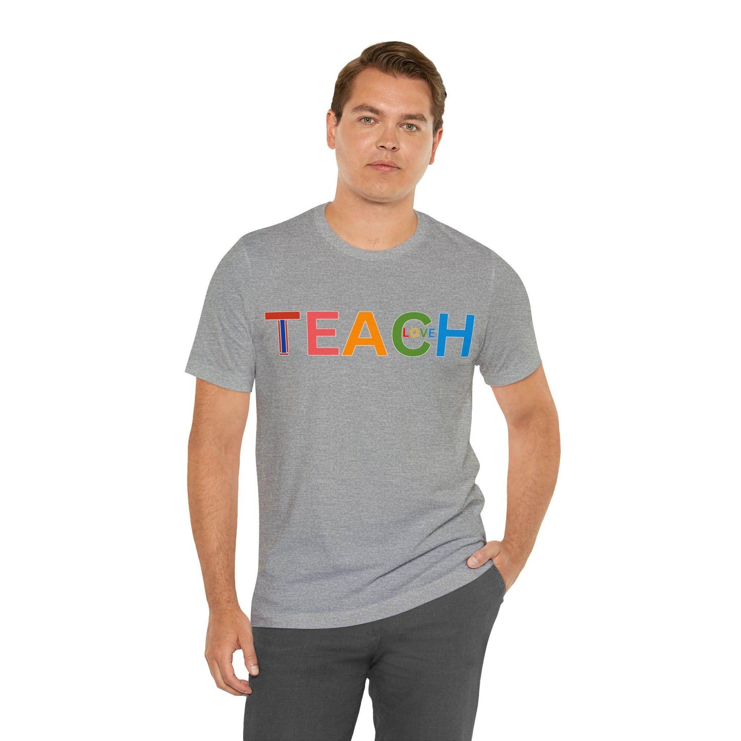 Wearing the "I Teach Love" shirt isn't just about personal style; it's about influencing lives. Each time you put it on, you're telling the world that you're not just teaching subjects, you're teaching love, empathy, and understanding. This shirt becomes a conversation starter, opening doors to discussions about the profound impact educators have on society. It's a statement that transcends fashion, leaving an indelible mark on hearts and minds.These t-shirts have-ribbed knit collars to bolster shaping. The shoulders have taping for better fit over time. Dual side seams hold the garment's shape for longer. .: 100% Airlume combed and ringspun cotton (fiber content may vary for different colors) .: Light fabric (4.2 oz/yd² (142 g/m²)) .: Retail fit .: Tear away label .: Runs true to size