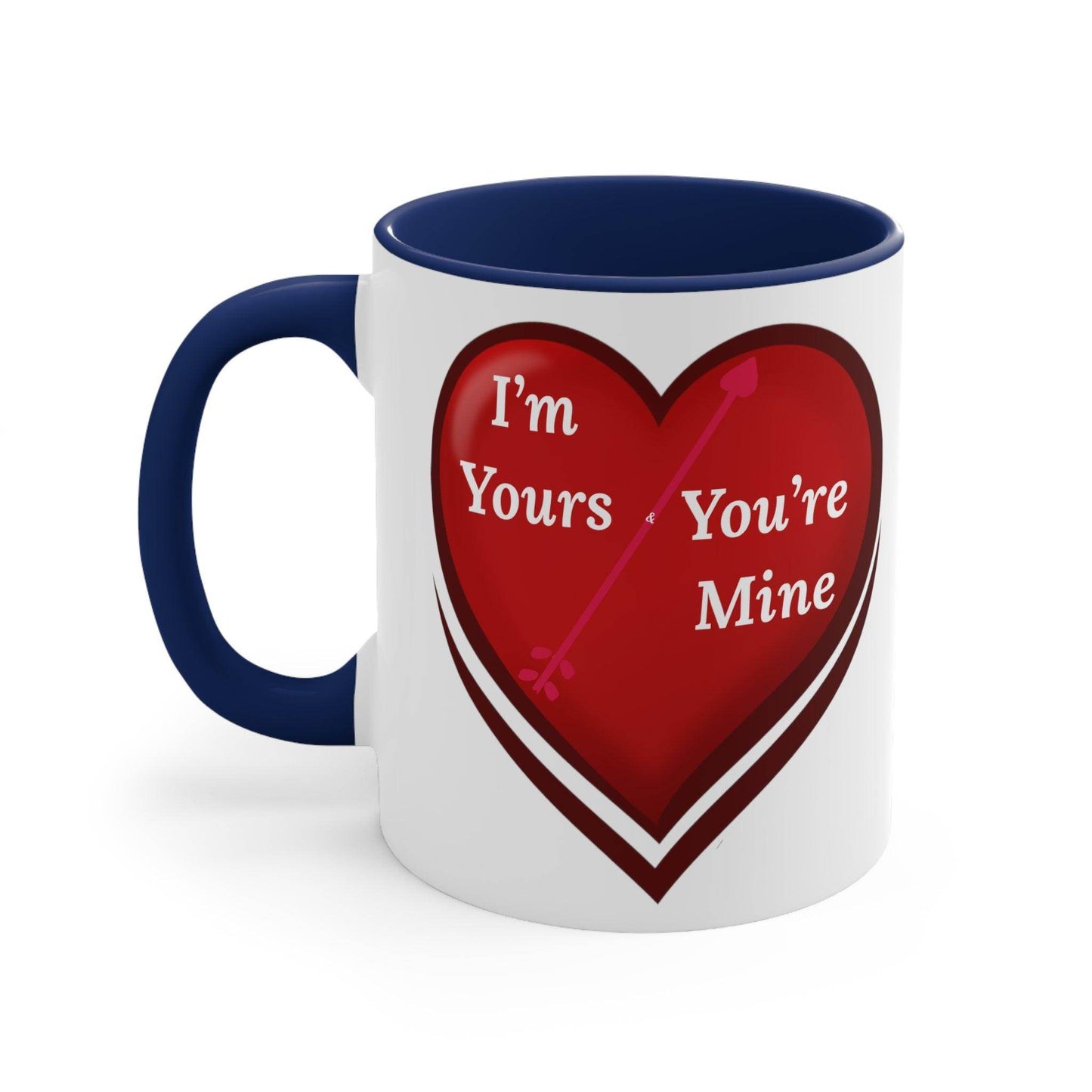 I'm Yours and You're Mine with Heart Mug, 11oz, Add some color to your routine with this two-tone, custom accent coffee mug. This 11oz mug features an accented C-Handle that is comfortable to use, as well as an accented interior to add more contrast and character. With your design on this mug, you get an instant winner of a product. .: White ceramic with colored interior and handle .: C-handle .: Eye-catching color contrast