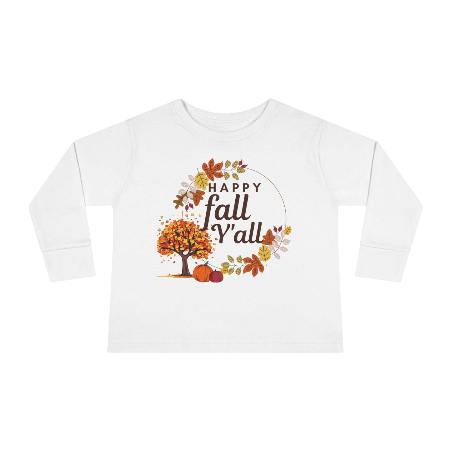 Capture the magic of fall and watch your child's face light up with our Kids Happy Fall Y'all Shirt. Order now and let the season of crisp air, colorful leaves, and pumpkin spice everything fill your child's heart with happiness!The custom toddler long-sleeve tee is made from 100% combed ringspun cotton fine jersey. Built to last, the garment features a topstitched ribbed collar and shoulder-to-shoulder self-fabric back-neck taping. These inclusions boost durability, fit, and comfort. The label is EasyTear™, a nice feature for those with sensitive skin. .: 100% combed, ring-spun cotton (fiber content may vary for different colors) .: Light fabric (4.5 oz/yd² (153 g/m²)) .: Toddler unisex fit .: Tear away label