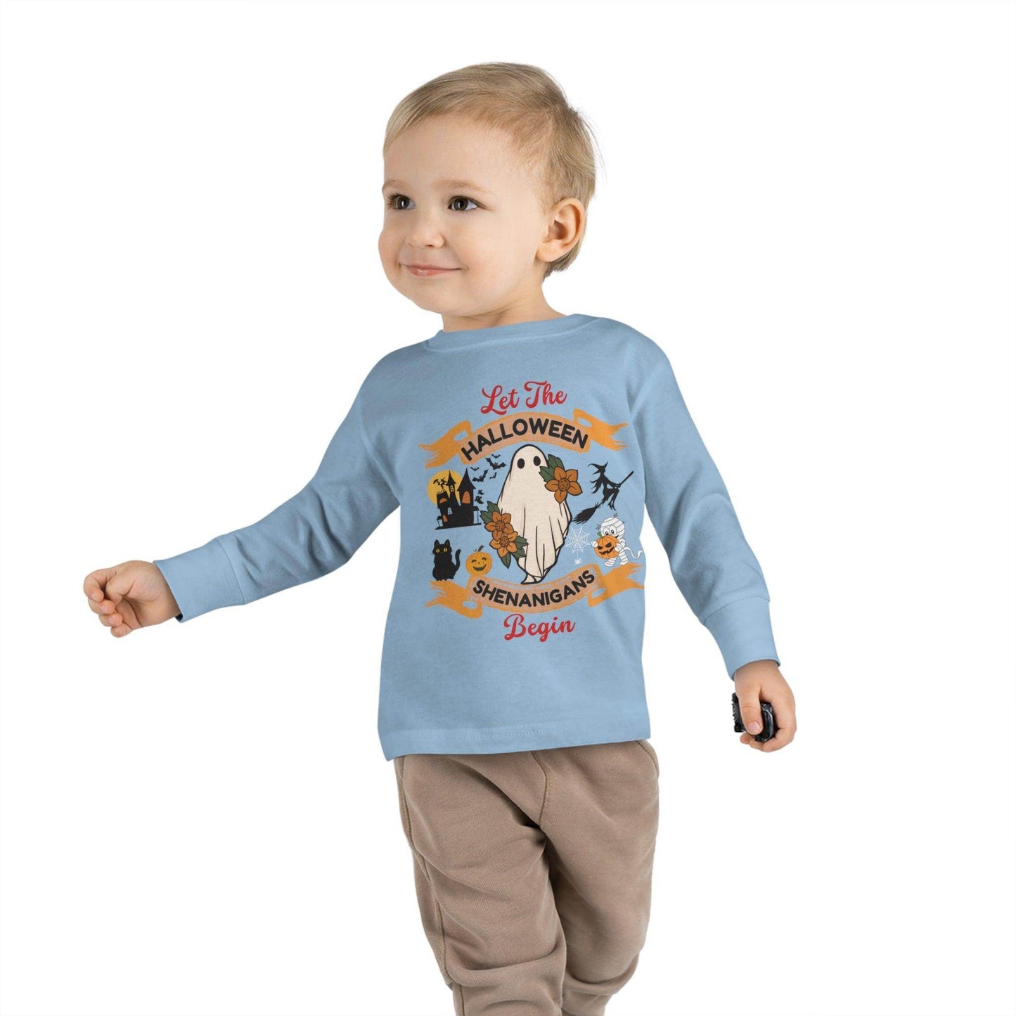 Make Halloween unforgettable for your little one or share the Halloween spirit with the children you hold dear. Let the Halloween shenanigans begin with our "Let the Halloween Shenanigans Begin" Kids Shirt. The custom toddler long-sleeve tee is made from 100% combed ringspun cotton fine jersey. Built to last, the garment features a topstitched ribbed collar and shoulder-to-shoulder self-fabric back-neck taping. These inclusions boost durability, fit, and comfort. The label is EasyTear™, a nice feature for those with sensitive skin. .: 100% combed, ring-spun cotton (fiber content may vary for different colors) .: Light fabric (4.5 oz/yd² (153 g/m²)) .: Toddler unisex fit .: Tear away label