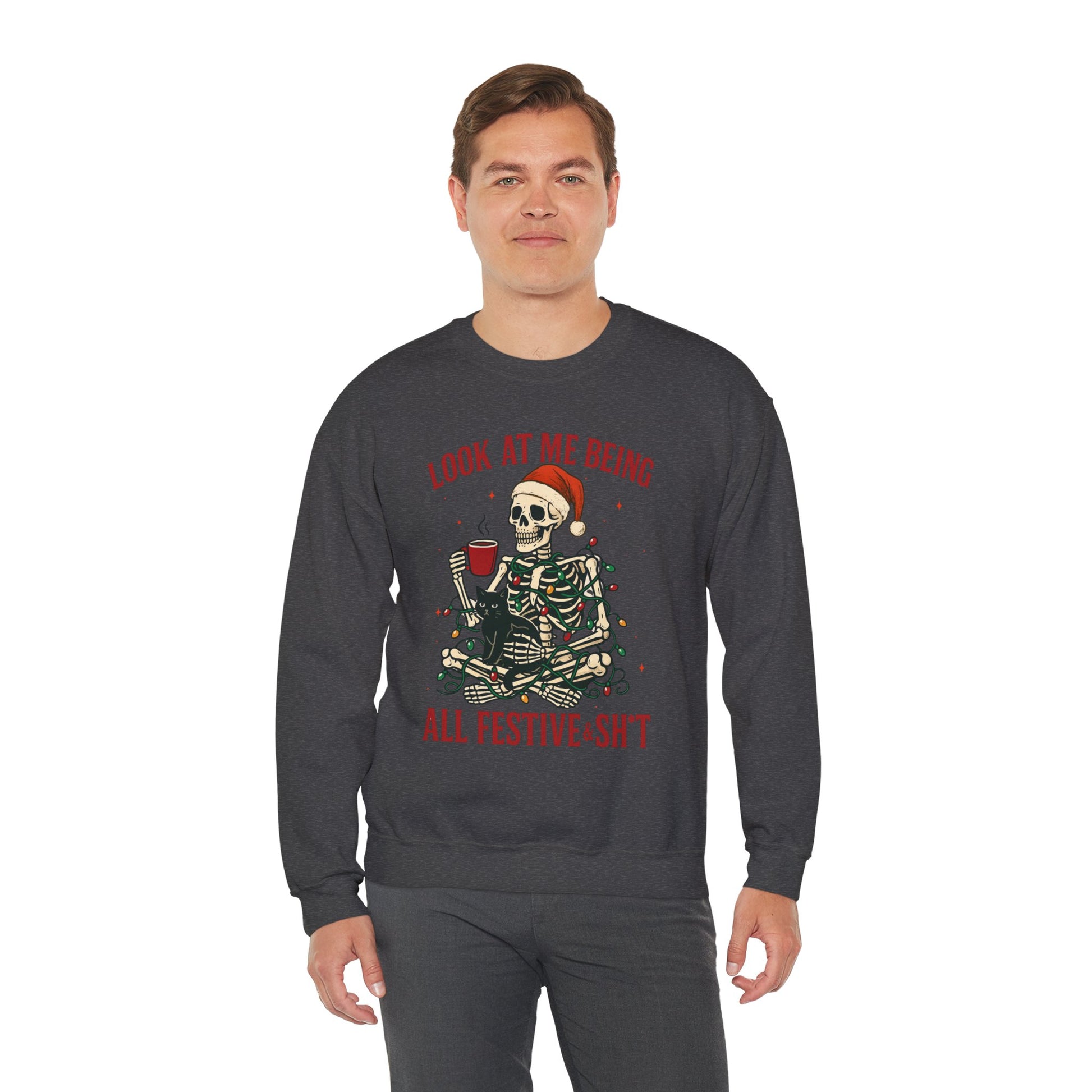 Bring sharp holiday humor to your wardrobe with our skeleton Christmas sweatshirt—a soft unisex crewneck featuring a skeleton wrapped in string lights with the quote “Look At Me Being All Festive and SH’T” on the artwork. Comfortable, photo-ready, and designed to spark conversation at gatherings and casual days alike