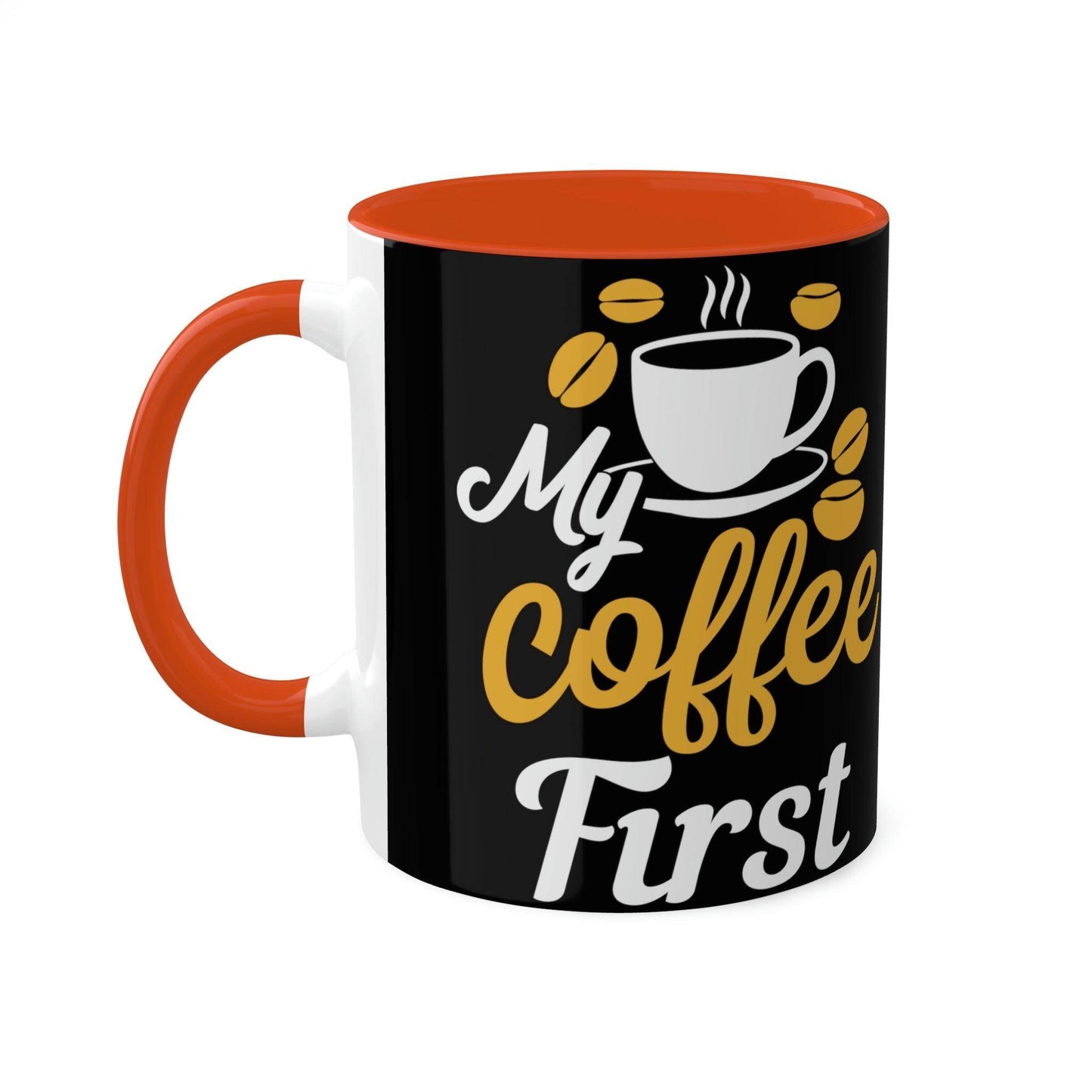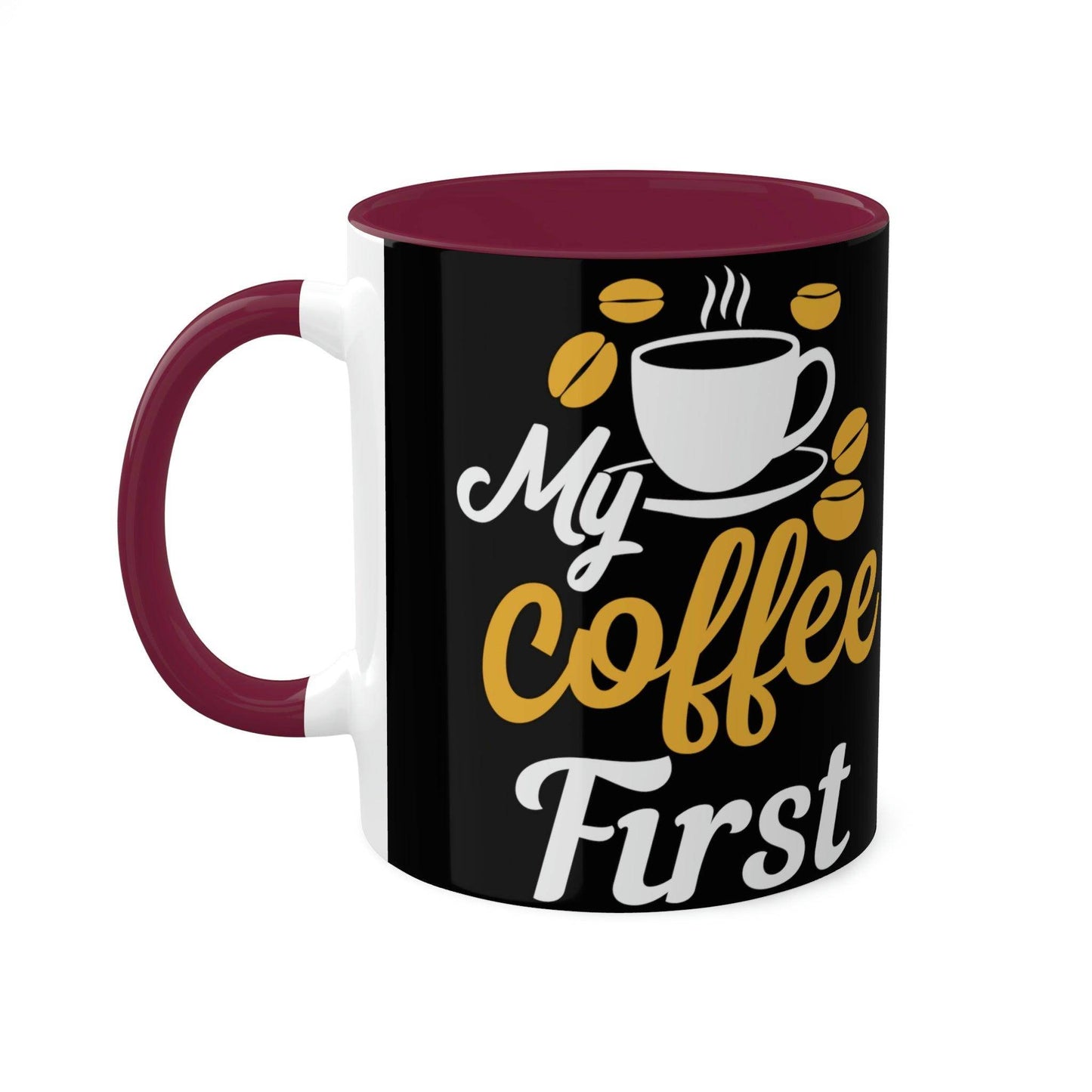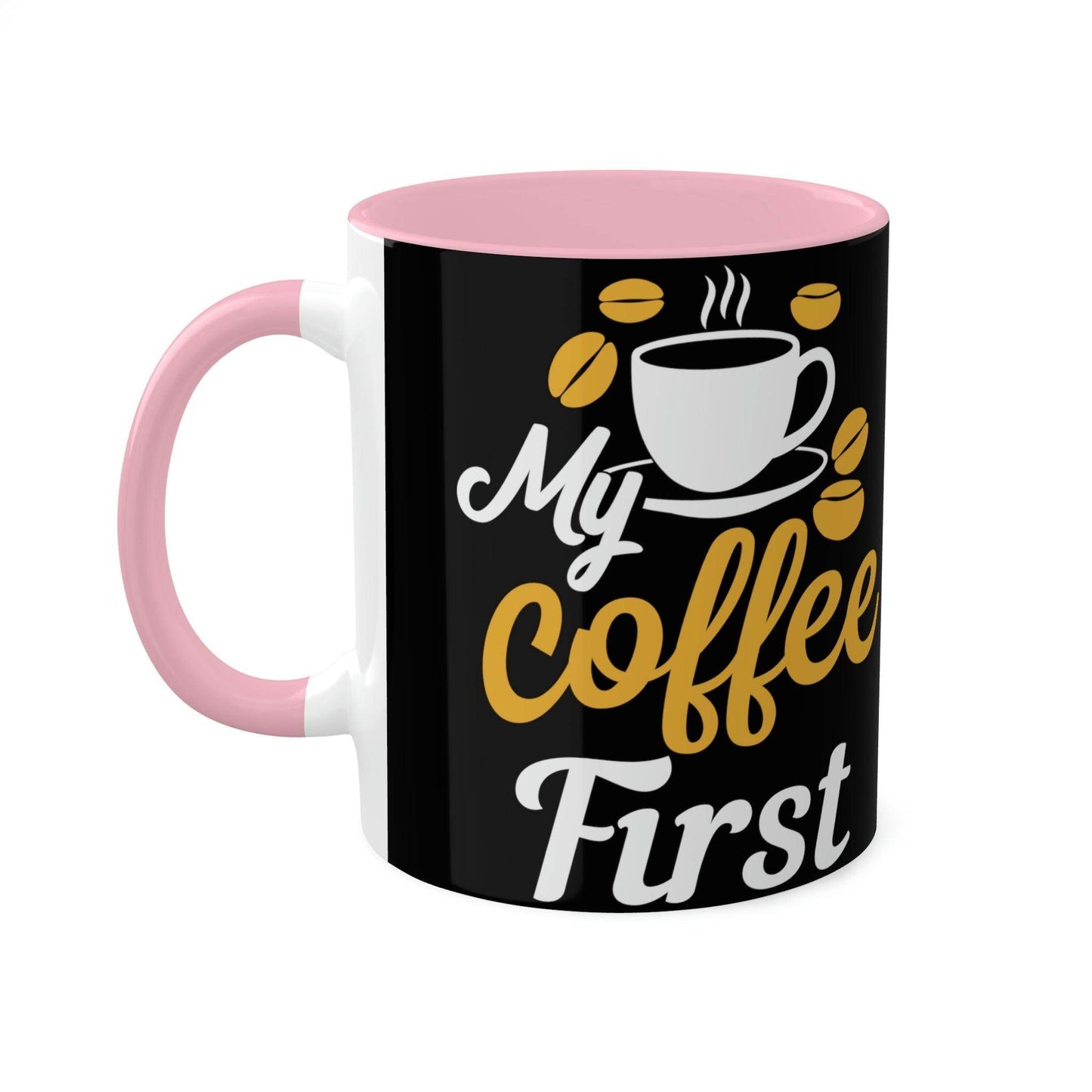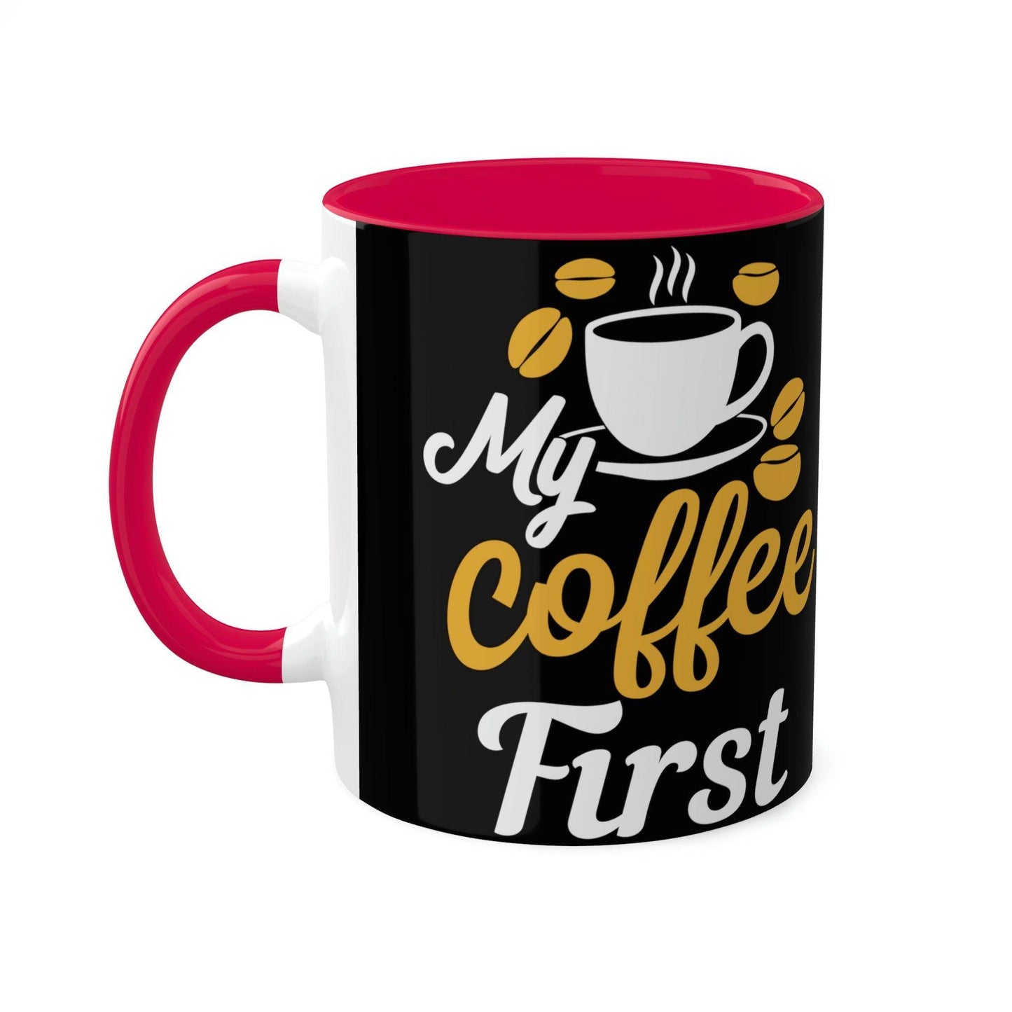My coffee first Mugs, Mugs are a staple in every kitchen and when they're combined with a custom flair, they become instant favorites. Available in 12 color options, these mugs hold 11oz of your favorite pick-me-up juice and come with a colored handle and interior. The glossy finish adds a classy touch that perfectly complements the high-fidelity artwork print.