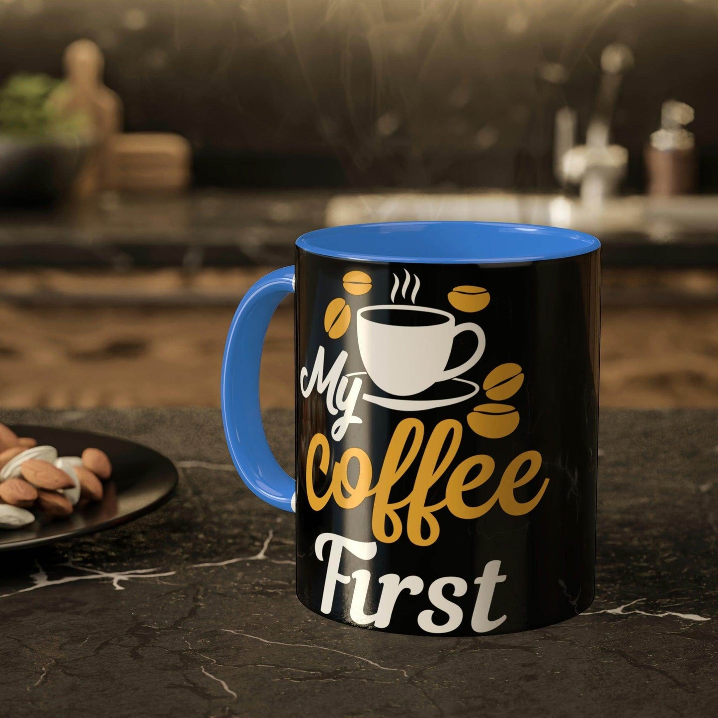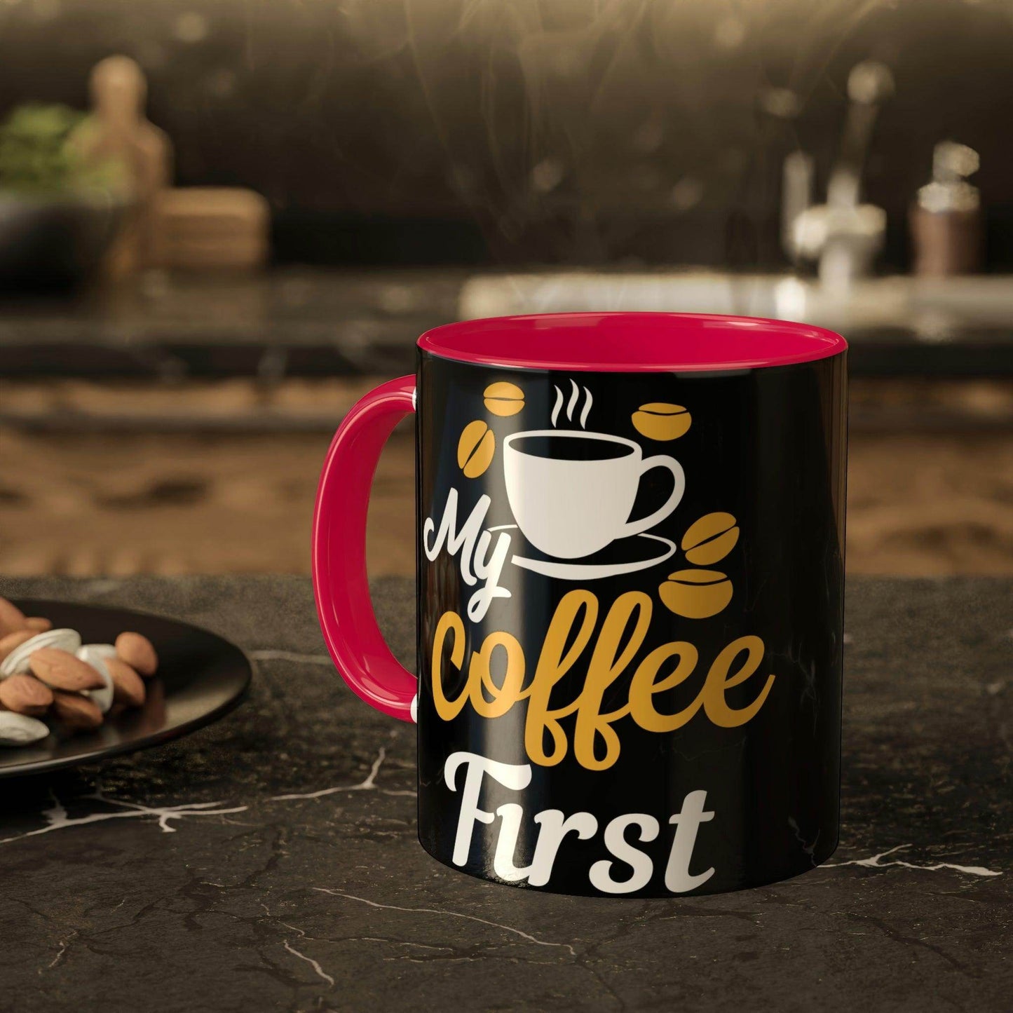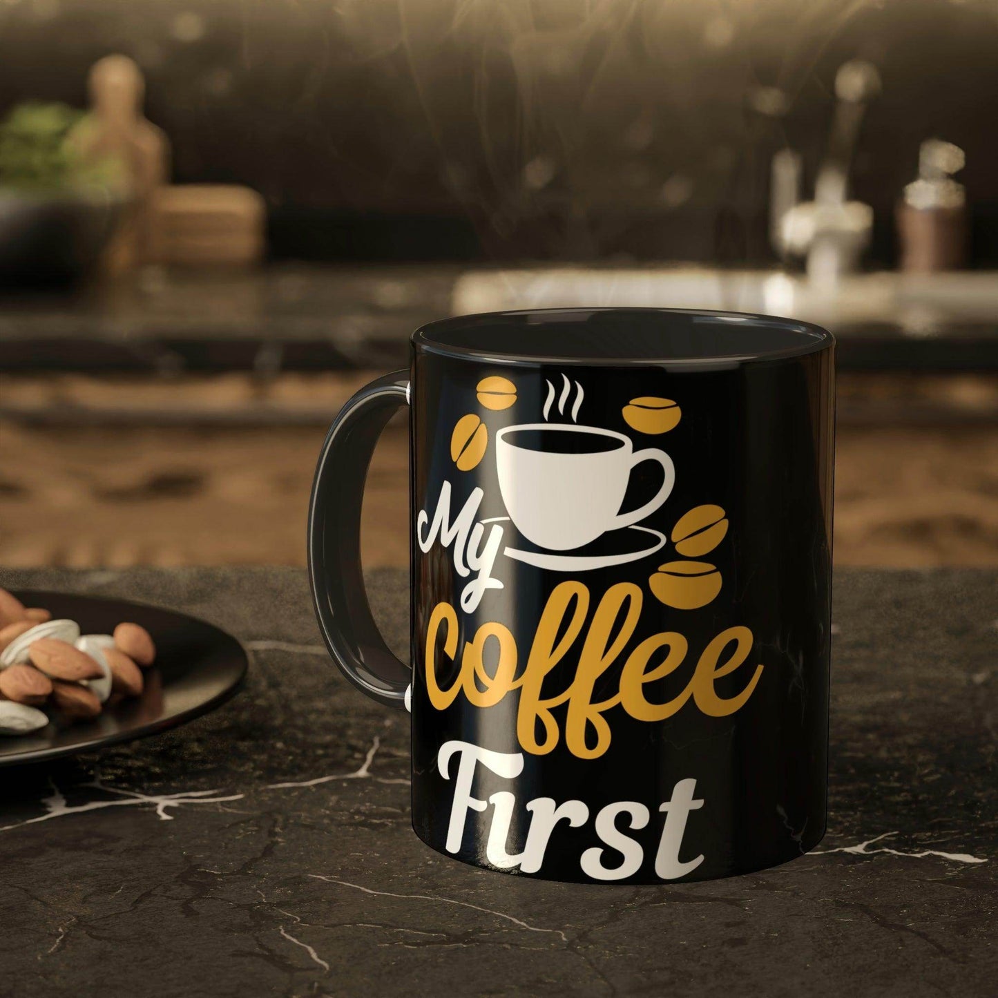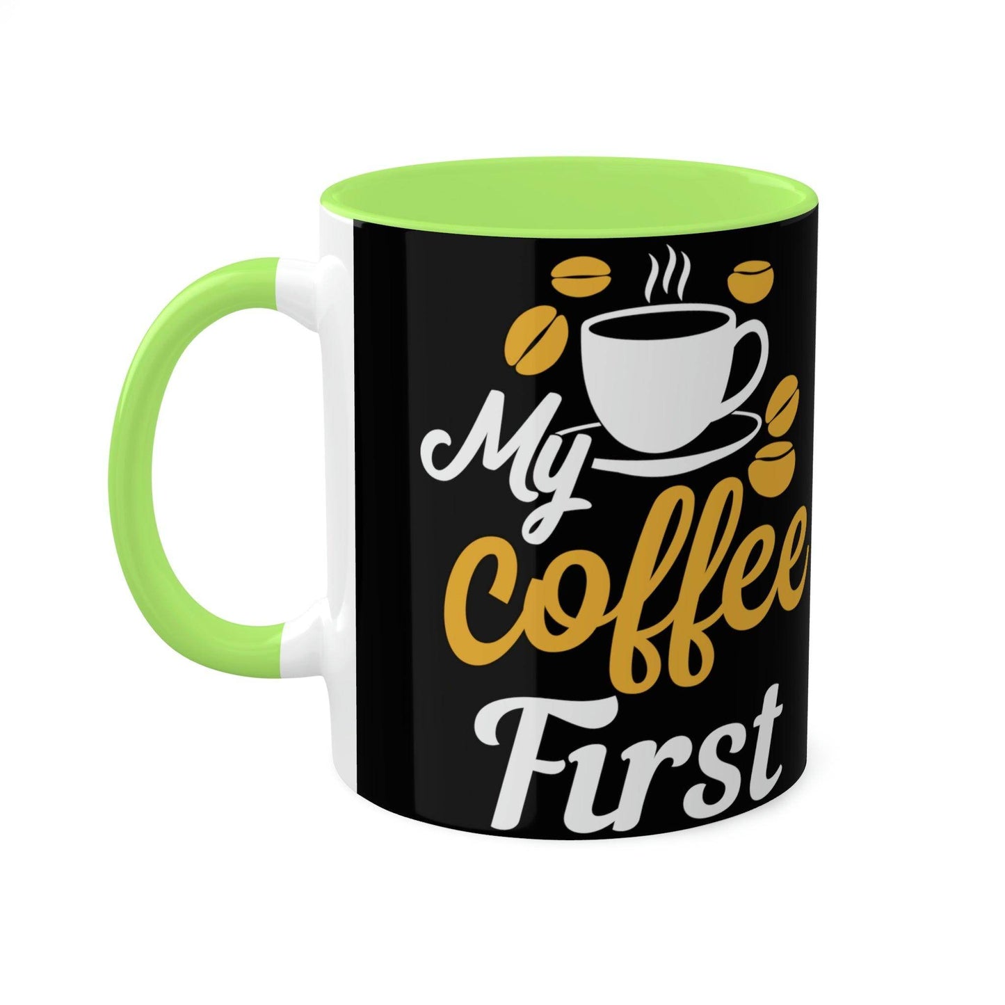 My coffee first Mugs, Mugs are a staple in every kitchen and when they're combined with a custom flair, they become instant favorites. Available in 12 color options, these mugs hold 11oz of your favorite pick-me-up juice and come with a colored handle and interior. The glossy finish adds a classy touch that perfectly complements the high-fidelity artwork print.