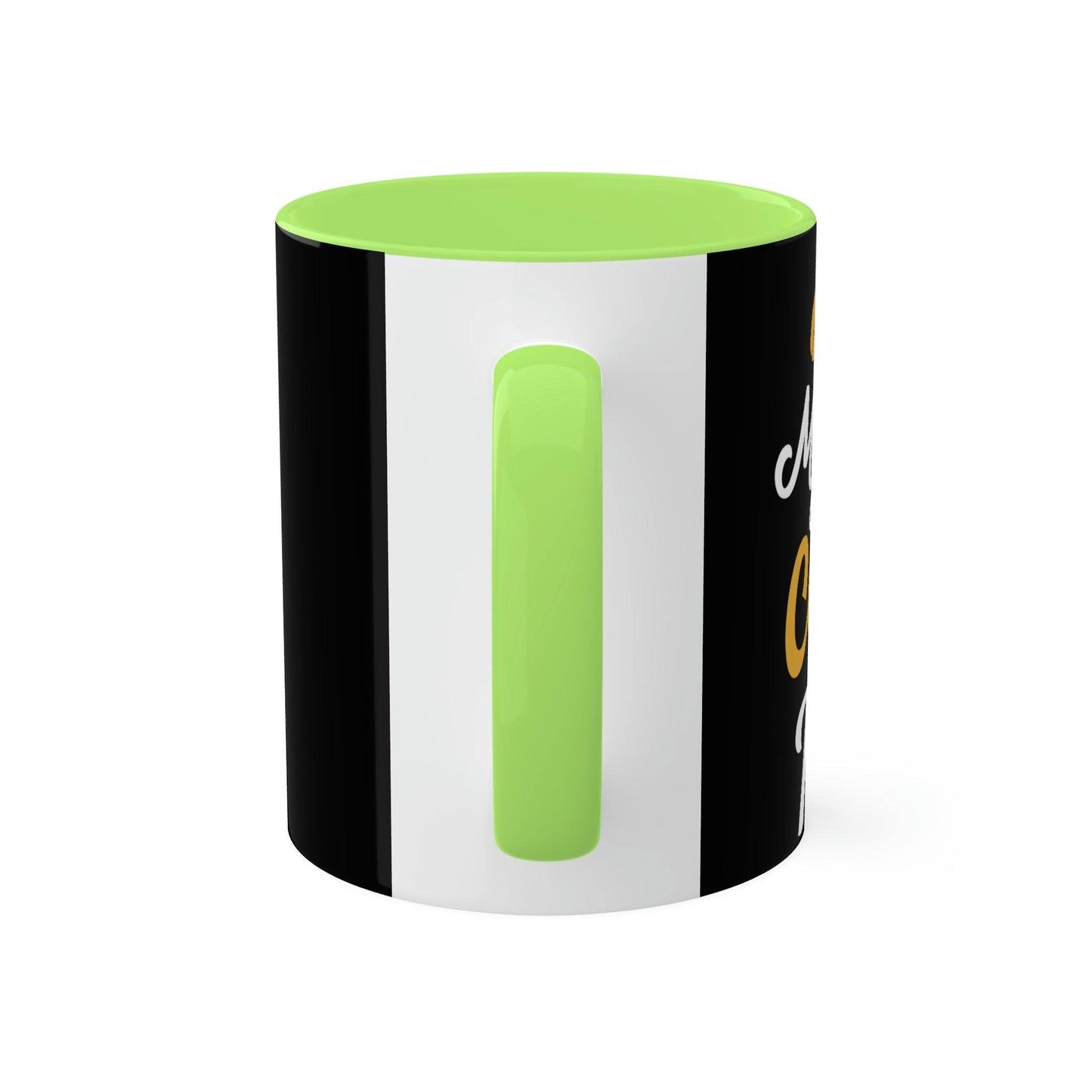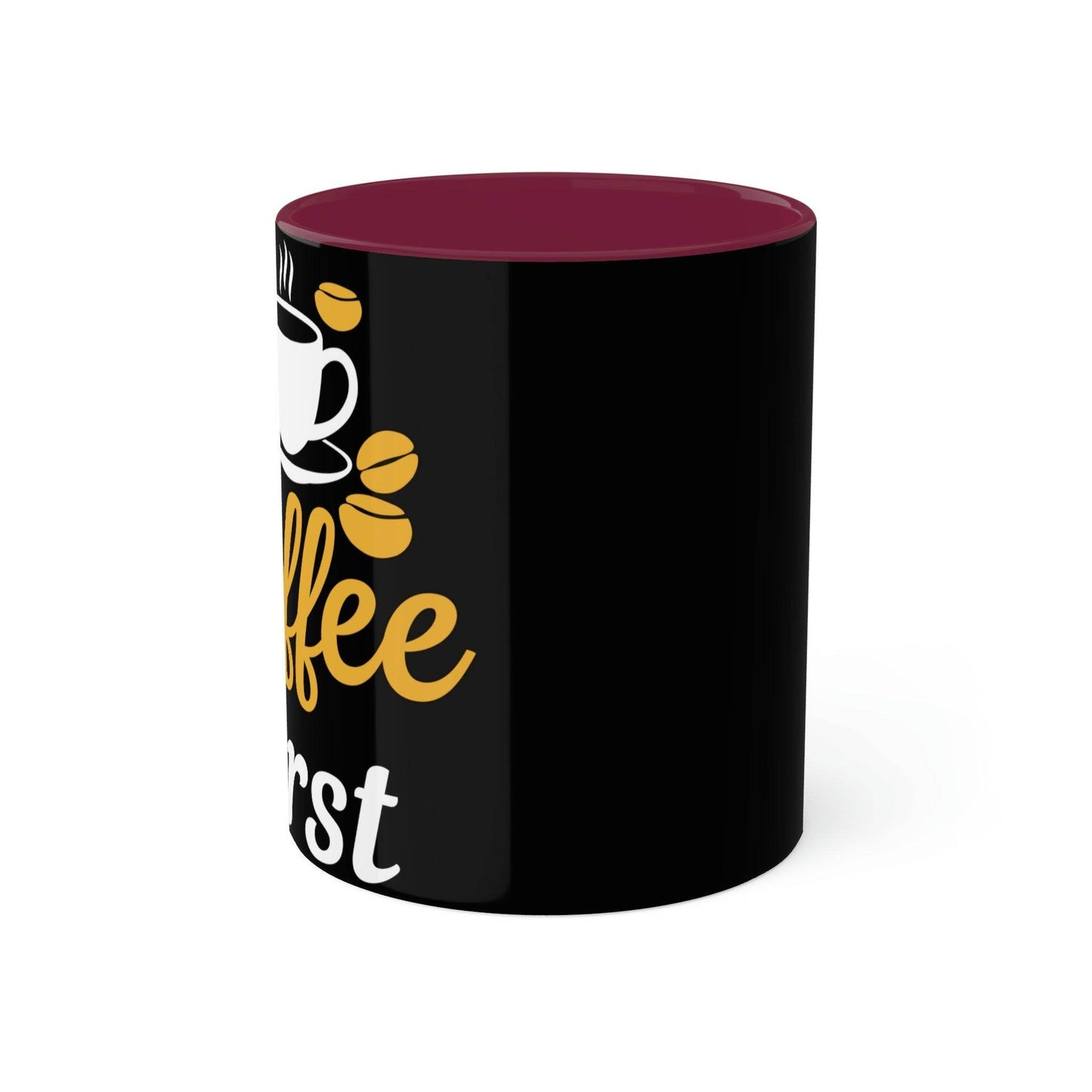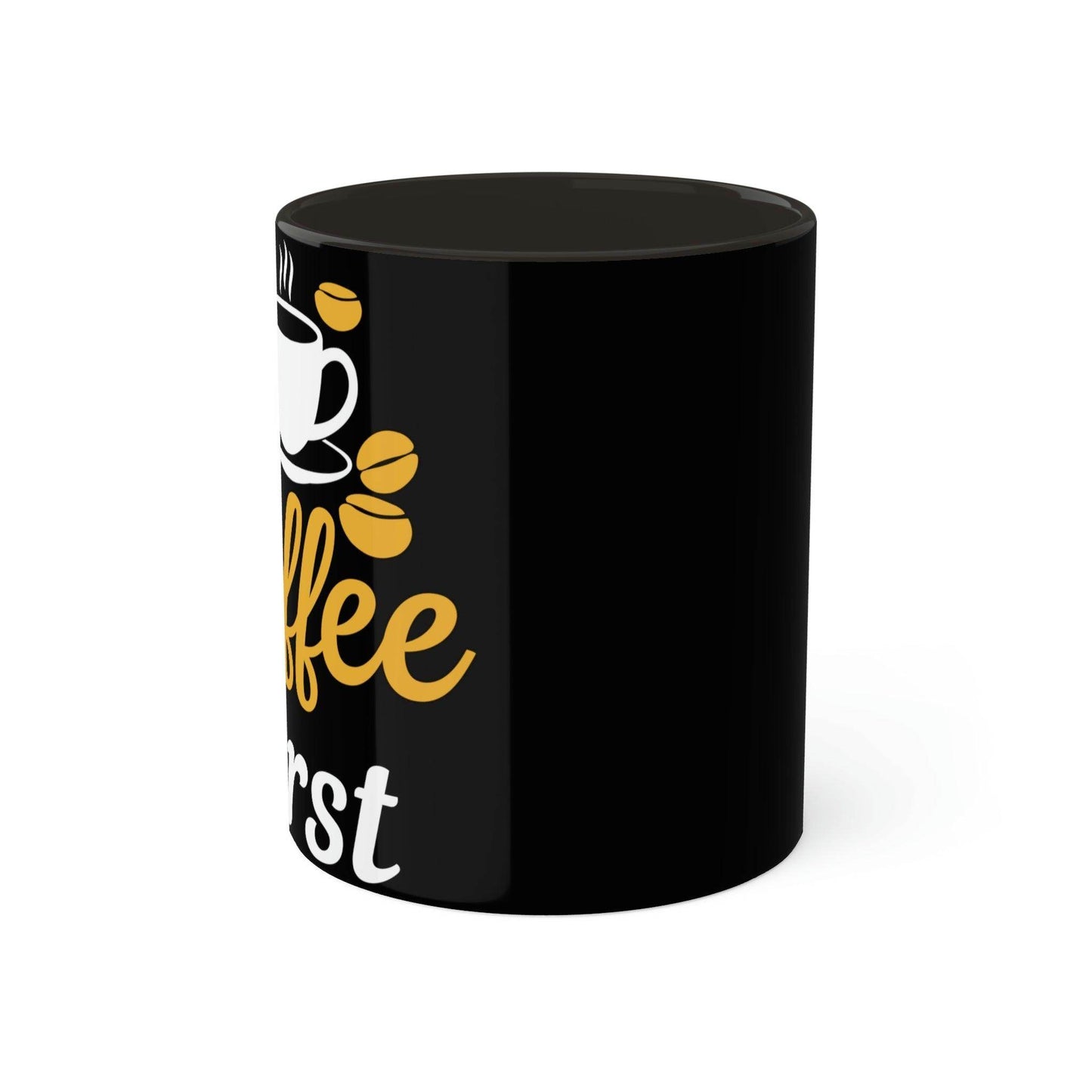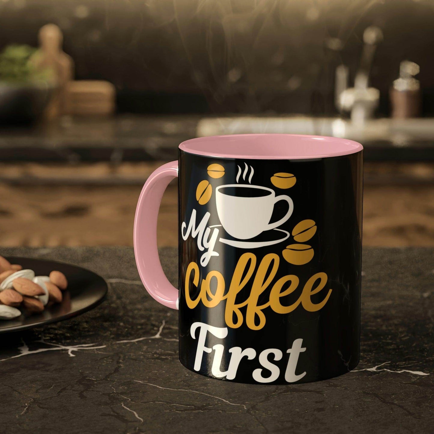 My coffee first Mugs, Mugs are a staple in every kitchen and when they're combined with a custom flair, they become instant favorites. Available in 12 color options, these mugs hold 11oz of your favorite pick-me-up juice and come with a colored handle and interior. The glossy finish adds a classy touch that perfectly complements the high-fidelity artwork print.