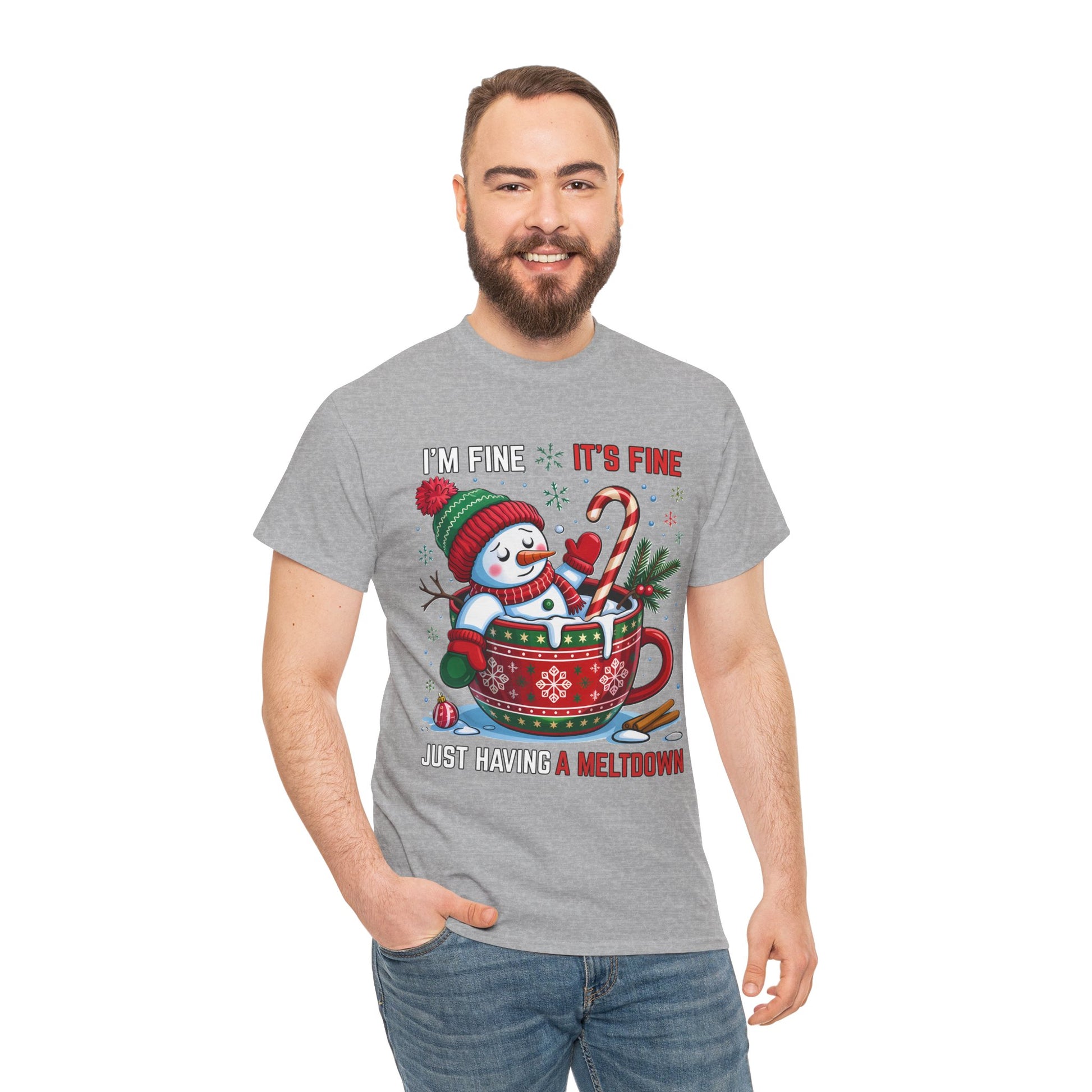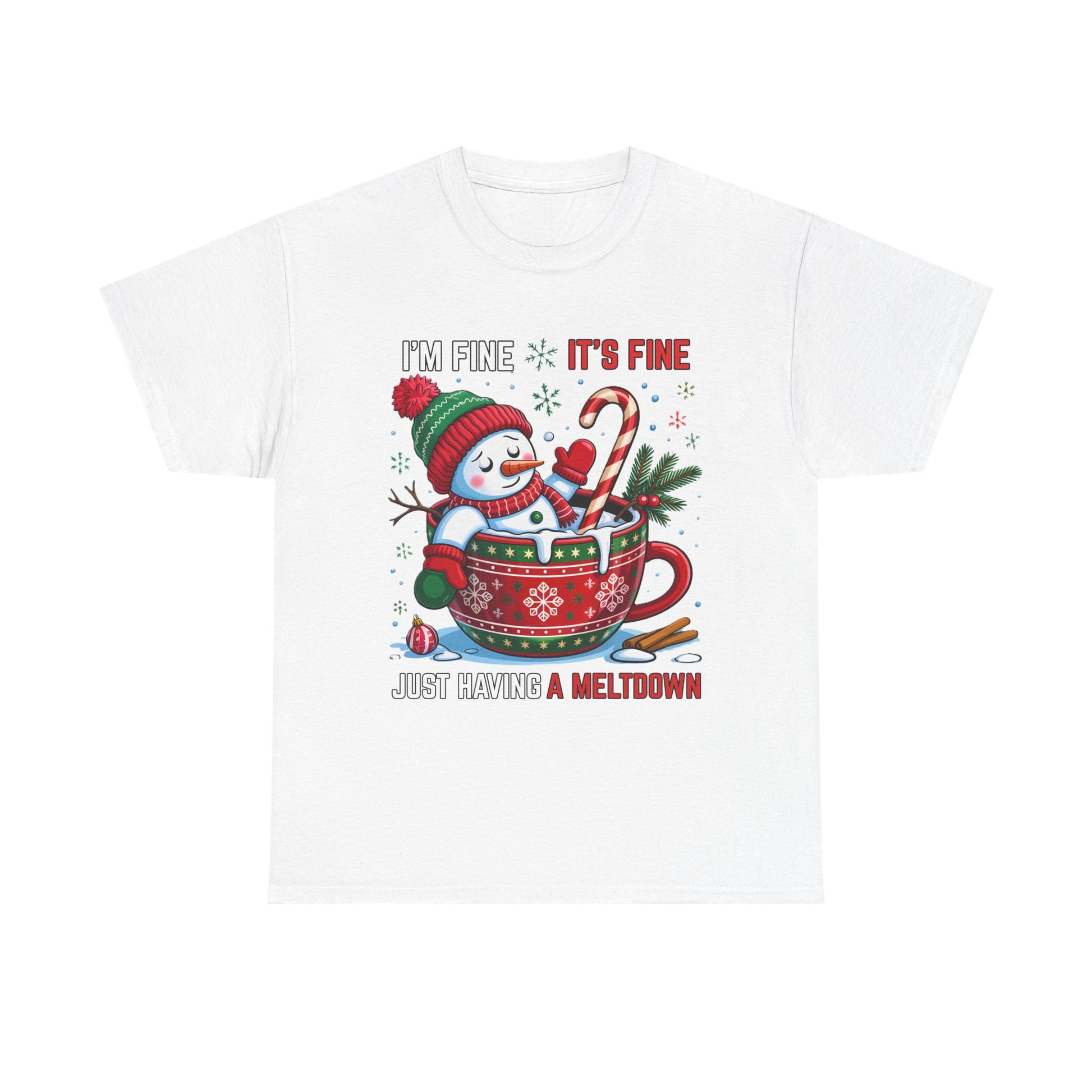 This T-Shirt features a humorous design of a snowman melting in a mug with the phrase 'I'm Fine It's Fine I'M Just Having A Meltdown'. Perfect for those who appreciate a touch of humor in their wardrobe. The classic fit and comfortable fabric make it suitable for everyday wear, and the design adds a playful vibe to any outfit. Ideal for those who enjoy quirky and unique apparel. Relevant for winter holidays and casual occasions.