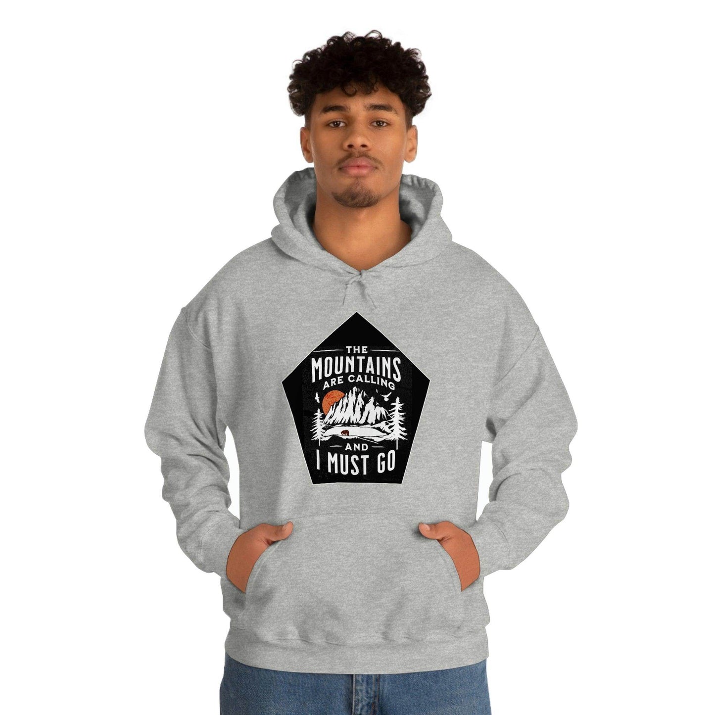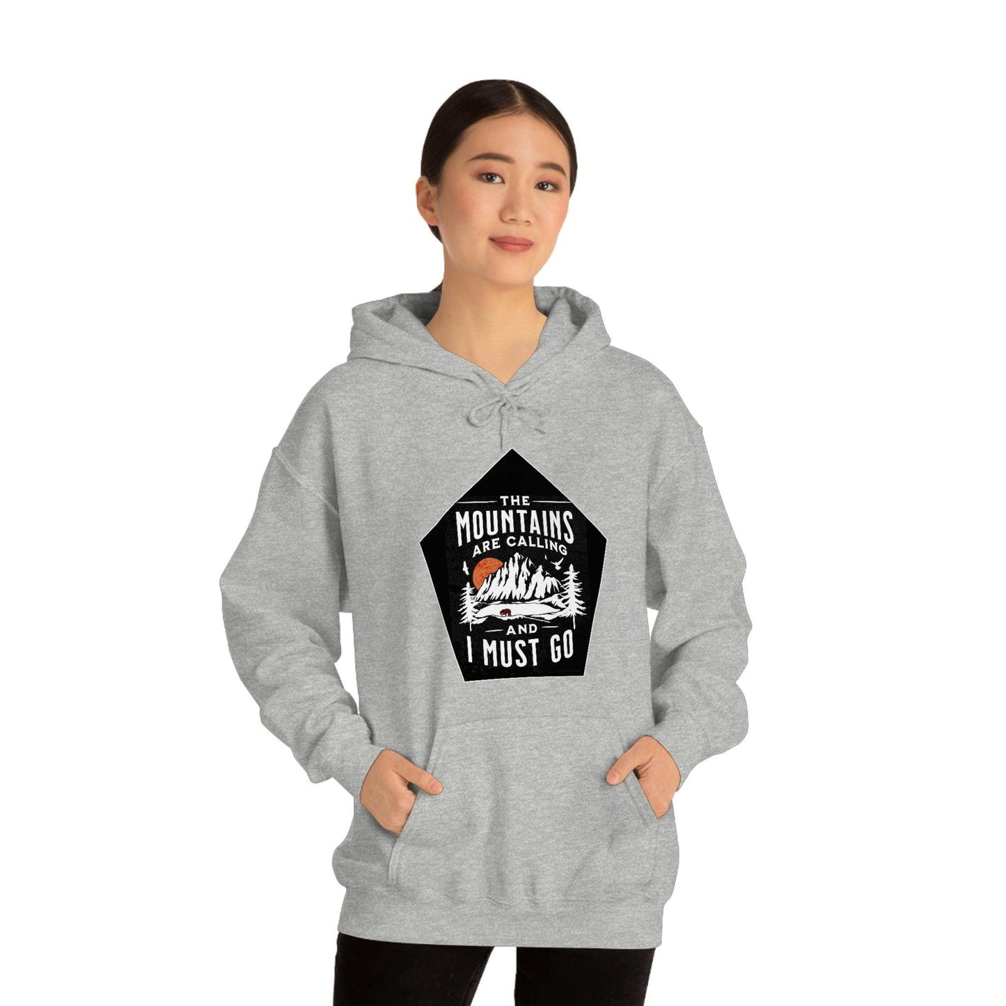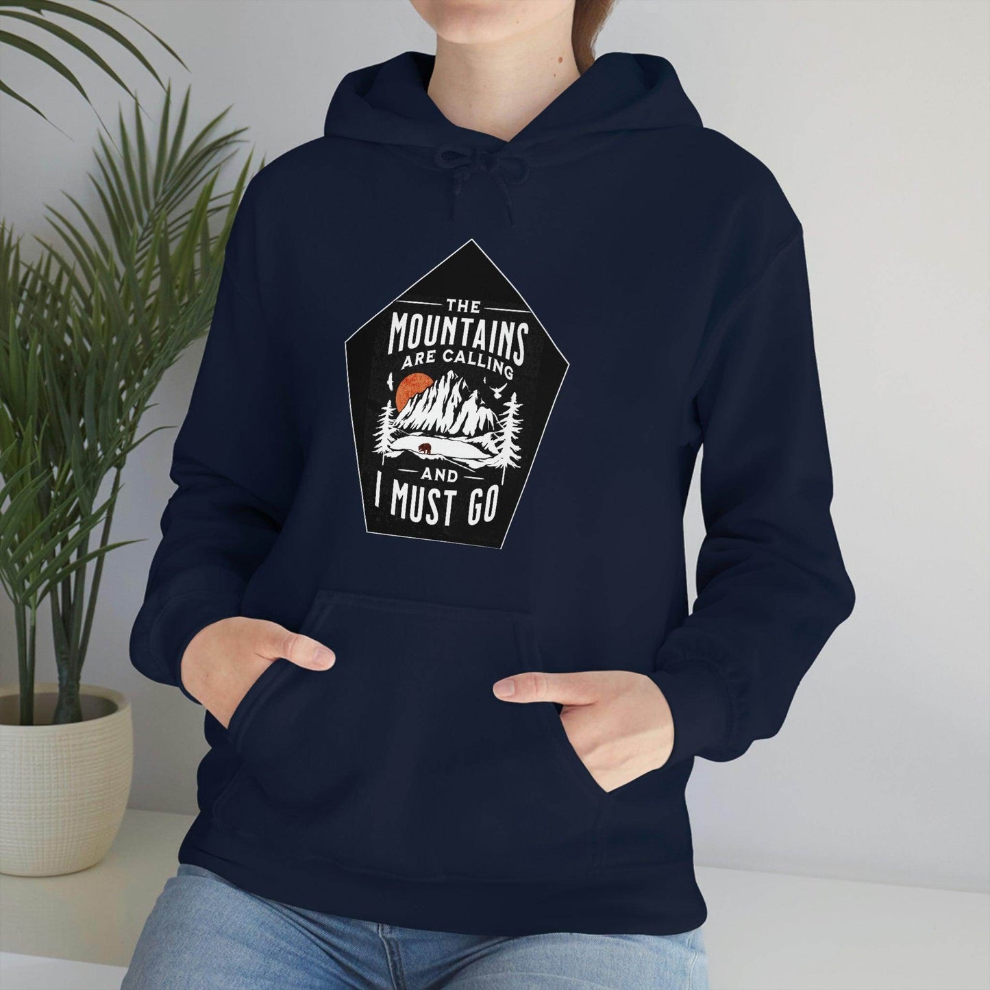 The Mountains are Calling and I Must Go, Hooded Sweatshirt, This unisex heavy blend hooded sweatshirt is relaxation itself. Made with a thick blend of cotton and polyester, it feels plush, soft and warm, a perfect choice for any cold day. In the front, the spacious kangaroo pocket adds daily practicality while the hood's drawstring is the same color as the base sweater for extra style points. .: 50% cotton, 50% polyester .: Medium-heavy fabric (8.0 oz/yd² (271 g/m²)) .: Classic fit .: Tear-away label .: Runs true to size